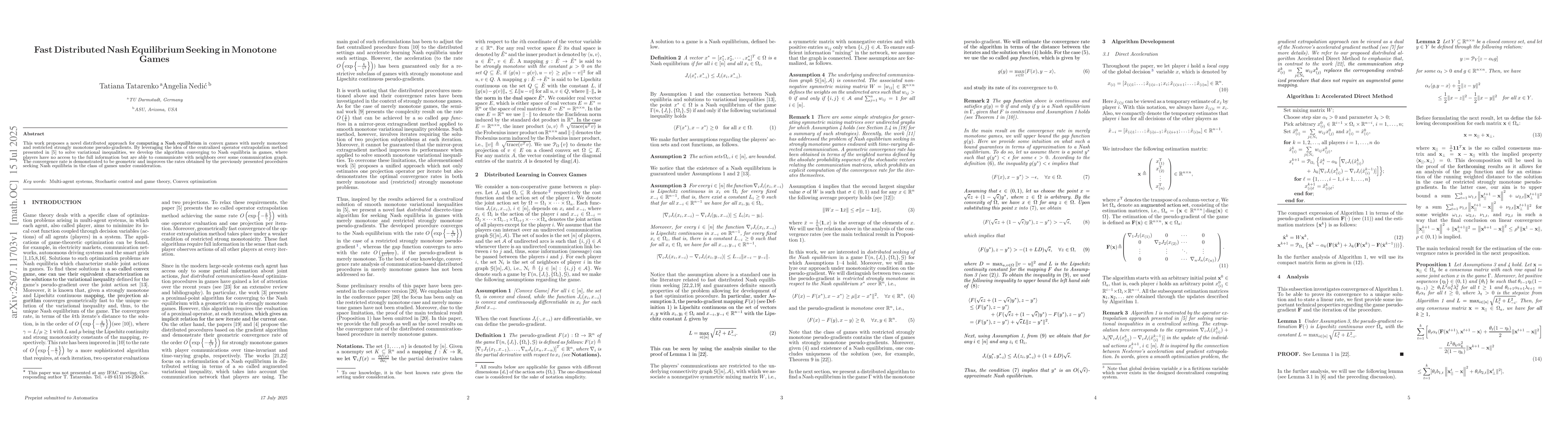 This work proposes a novel distributed approach for computing a Nash equilibrium in convex games with merely monotone and restricted strongly monotone pseudo-gradients. By leveraging the idea of the centralized operator extrapolation method presented in [5] to solve variational inequalities, we develop the algorithm converging to Nash equilibria in games, where players have no access to the full information but are able to communicate with neighbors over some communication graph. The convergence rate is demonstrated to be geometric and improves the rates obtained by the previously presented procedures seeking Nash equilibria in the class of games under consideration.