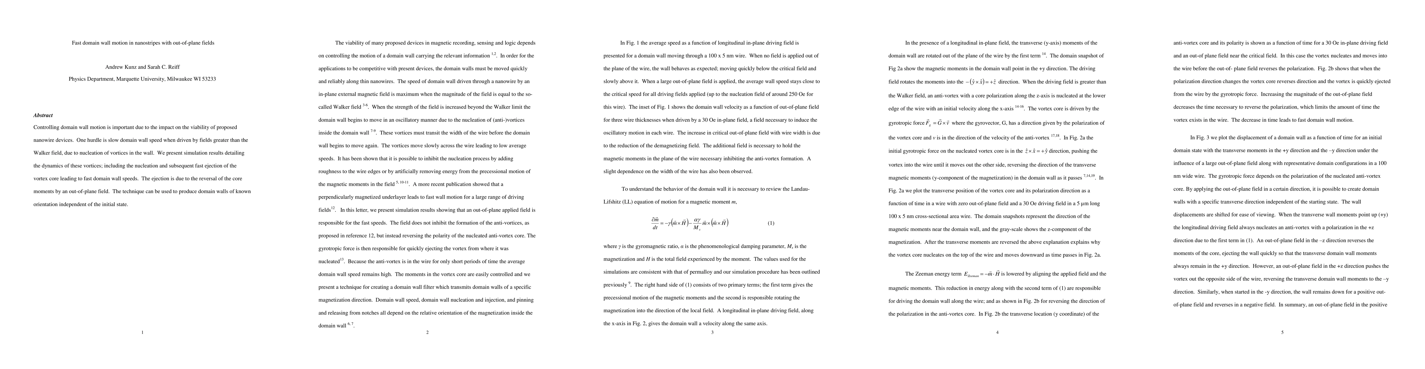 This paper investigates fast domain wall motion in nanostripes driven by out-of-plane fields, revealing the dynamics of vortex nucleation and ejection, which significantly enhances wall speed. The technique allows for domain walls of predictable orientation, independent of initial conditions.