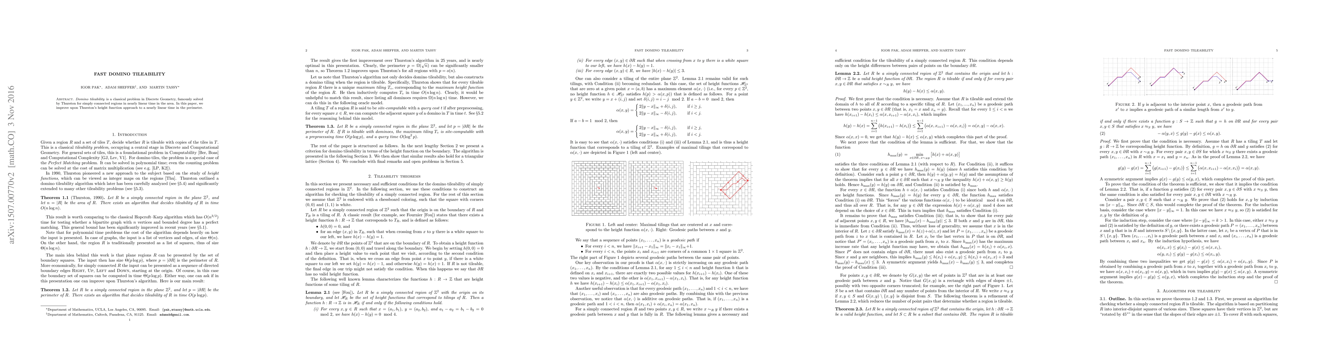 This paper enhances the classical problem of domino tileability in Discrete Geometry, achieving nearly linear time complexity based on the perimeter rather than the area, improving upon Thurston's original height function approach.