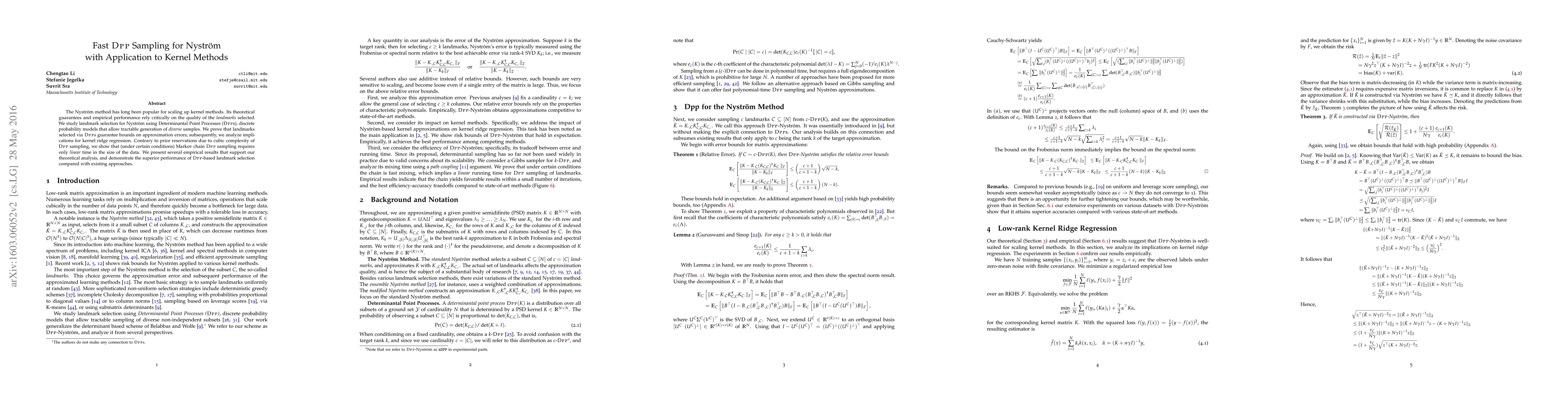 This paper proposes using Determinantal Point Processes (DPPs) for selecting landmarks in the Nyström method to scale up kernel methods, proving that DPP-selected landmarks guarantee approximation error bounds. It demonstrates that DPP sampling via Markov chains can be performed in linear time, contrary to cubic complexity concerns, and shows superior performance over existing landmark selection methods through theoretical and empirical analysis.