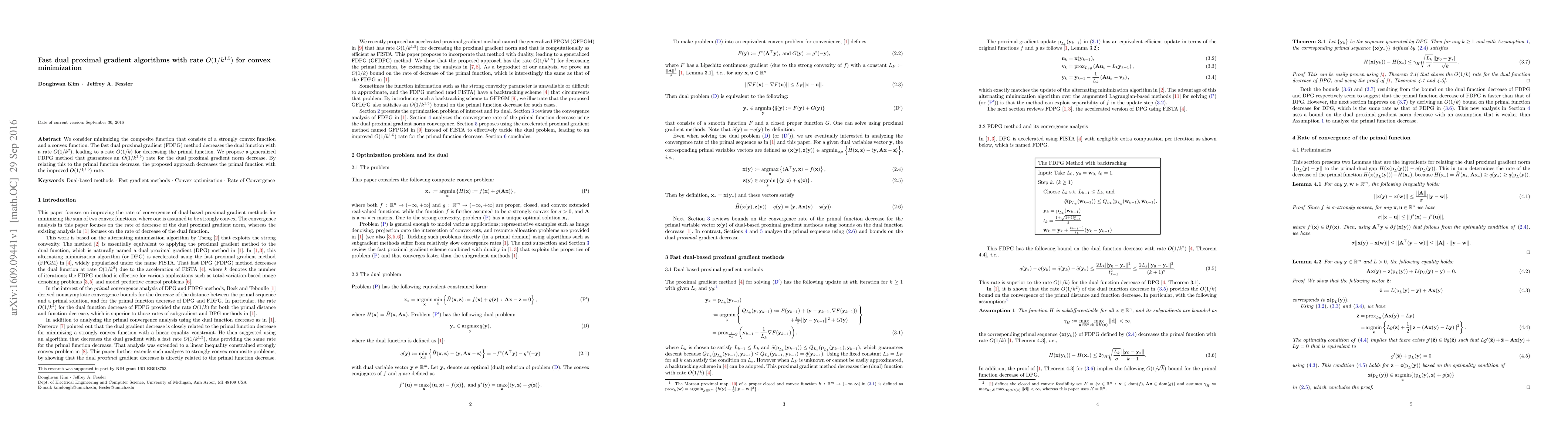 This paper proposes a generalized fast dual proximal gradient algorithm that achieves an $O(1/k^{1.5})$ rate for minimizing composite convex functions, improving upon the $O(1/k^2)$ rate of the original method. The approach enhances both dual and primal function convergence rates.