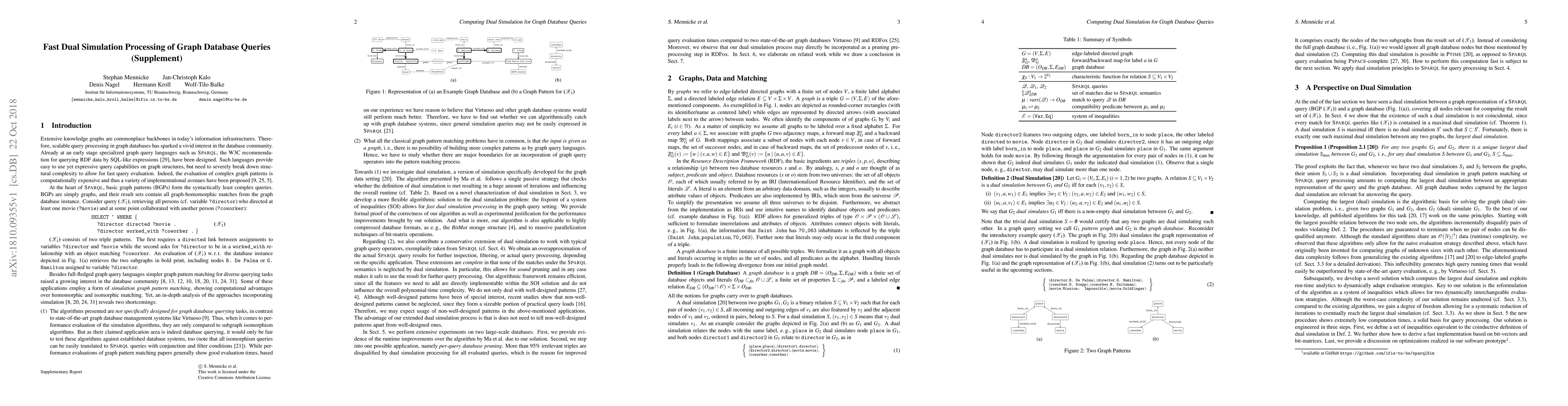 This paper introduces a novel dual simulation process to efficiently evaluate SPARQL queries on graph databases, achieving polynomial-time pattern matching and soundness for complex query operators. The supplement provides detailed proofs, experimental results, and complexity analysis to support the claims made in the original paper.