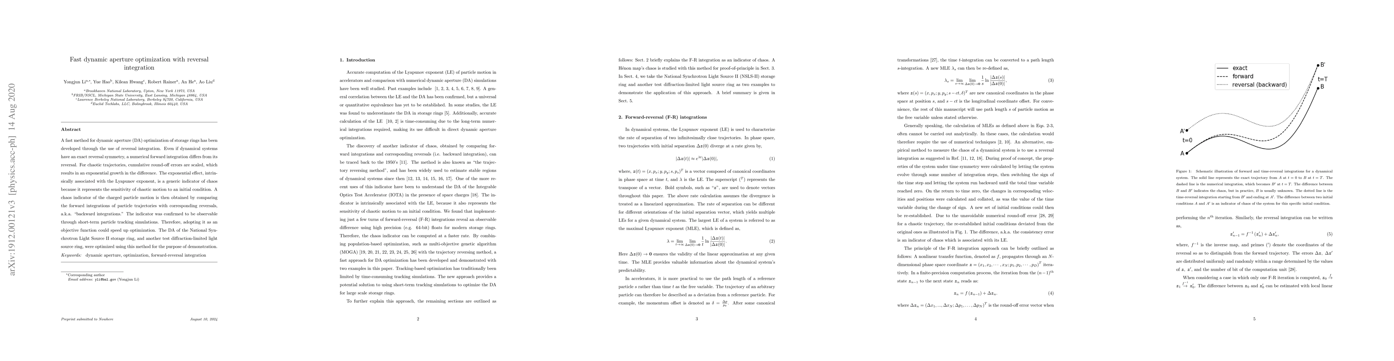 Researchers developed a fast method for optimizing dynamic aperture in storage rings using reversal integration, which captures chaos indicators of charged particle motion. This approach sped up optimization for two light source rings.