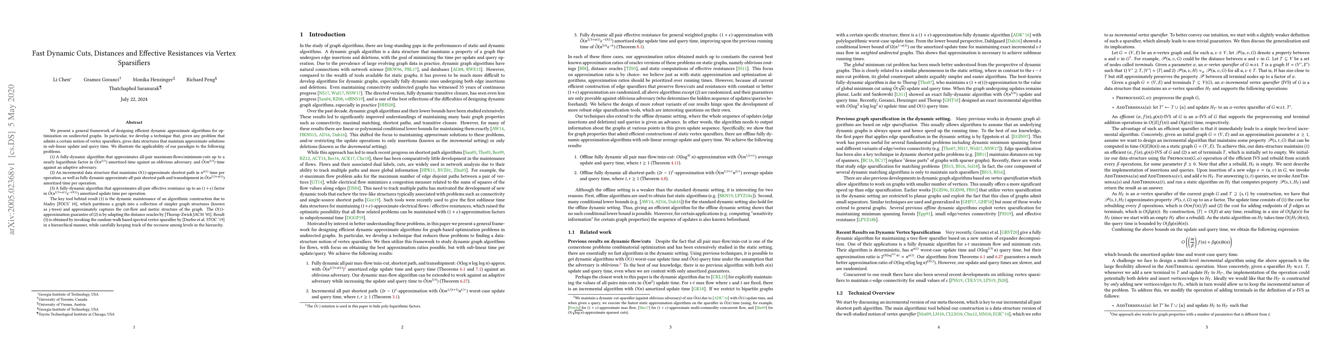 This paper introduces a framework for efficient dynamic approximate algorithms on undirected graphs using vertex sparsifiers. It presents sub-linear time data structures for maintaining approximate solutions for maximum-flows/minimum-cuts, shortest paths, and effective resistances, leveraging techniques from dynamic graph partitioning and spectral sparsification.