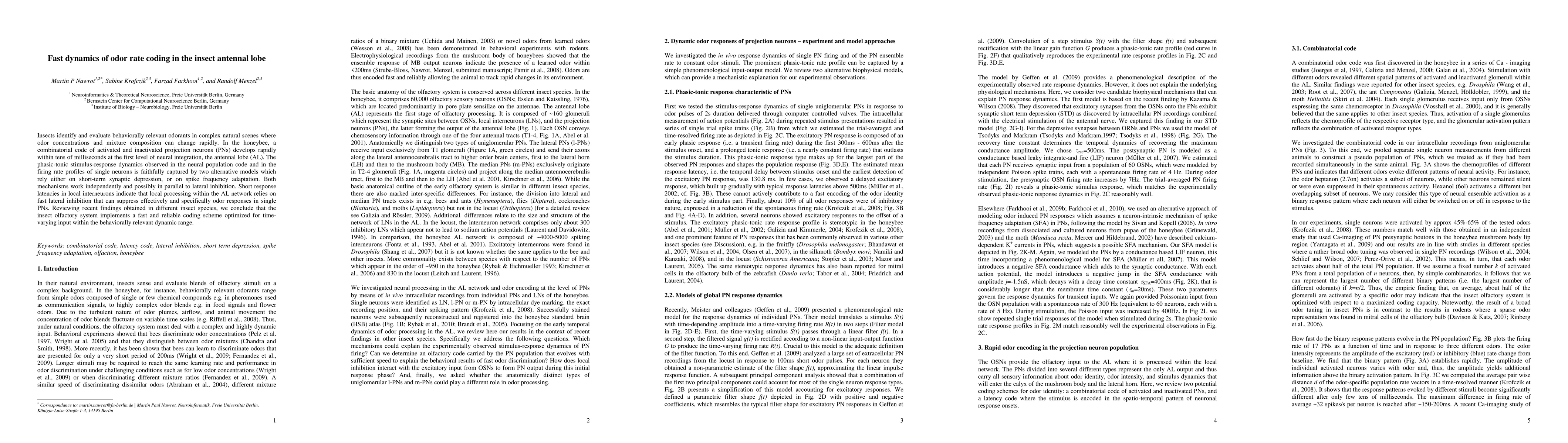 Insects identify and evaluate behaviorally relevant odorants in complex natural scenes where odor concentrations and mixture composition can change rapidly. In the honeybee, a combinatorial code of activated and inactivated projection neurons (PNs) develops rapidly within tens of milliseconds at the first level of neural integration, the antennal lobe (AL). The phasic-tonic stimulus-response dynamics observed in the neural population code and in the firing rate profiles of single neurons is faithfully captured by two alternative models which rely either on short-term synaptic depression, or on spike frequency adaptation. Both mechanisms work independently and possibly in parallel to lateral inhibition. Short response latencies in local interneurons indicate that local processing within the AL network relies on fast lateral inhibition that can suppress effectively and specifically odor responses in single PNs. Reviewing recent findings obtained in different insect species, we conclude that the insect olfactory system implements a fast and reliable coding scheme optimized for time-varying input within the behaviorally relevant dynamic range.