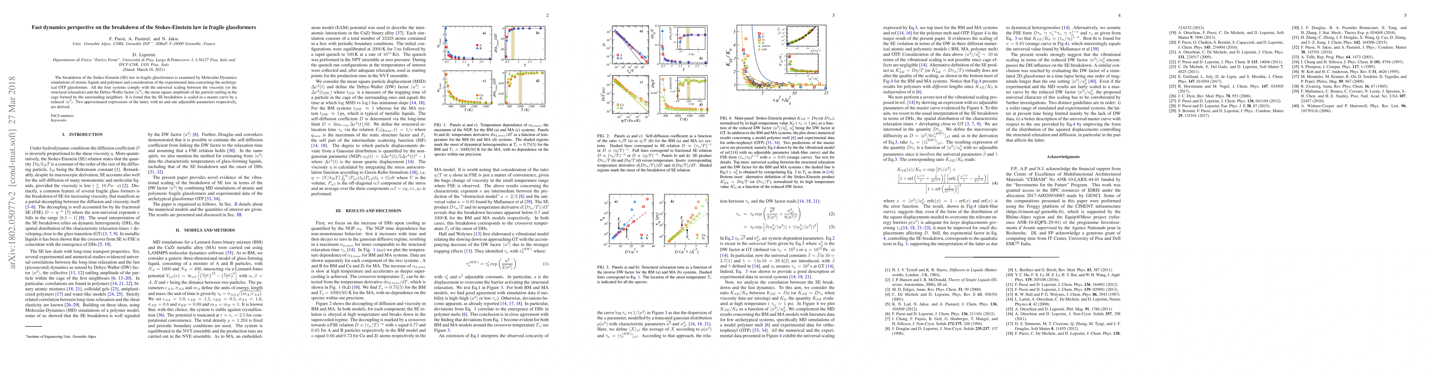 The breakdown of the Stokes-Einstein (SE) law in fragile glassformers is examined by Molecular-Dynamics simulations of atomic liquids and polymers and consideration of the experimental data concerning the archetypical OTP glassformer. All the four systems comply with the universal scaling between the viscosity (or the structural relaxation) and the Debye-Waller factor $\langle u^2\rangle$, the mean square amplitude of the particle rattling in the cage formed by the surrounding neighbors. It is found that the SE breakdown is scaled in a master curve by a reduced $\langle u^2\rangle$. Two approximated expressions of the latter, with no and one adjustable parameters respectively, are derived.