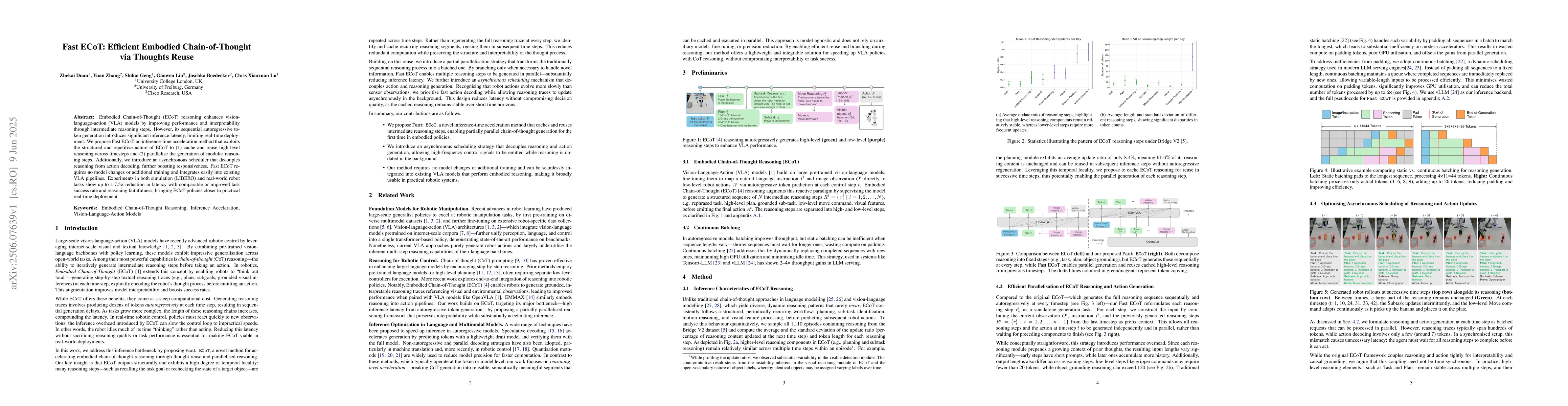Fast ECoT accelerates Embodied Chain-of-Thought reasoning in VLA models by caching and parallelizing intermediate steps, reducing latency by up to 7.5% while maintaining comparable task success rates.