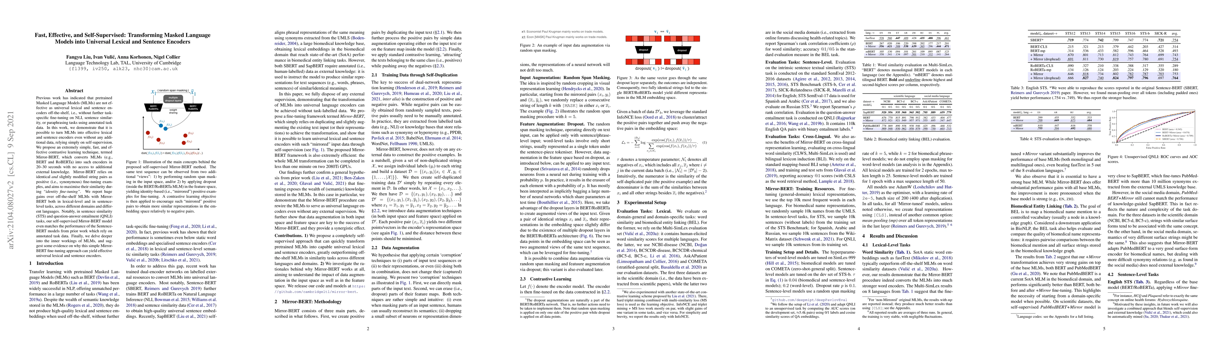 This paper proposes Mirror-BERT, a simple contrastive learning technique to transform Masked Language Models (MLMs) into effective universal lexical and sentence encoders without requiring additional data or supervision. Mirror-BERT achieves significant improvements over off-the-shelf MLMs in both lexical and sentence-level tasks, matching the performance of task-tuned models in standard semantic similarity benchmarks.