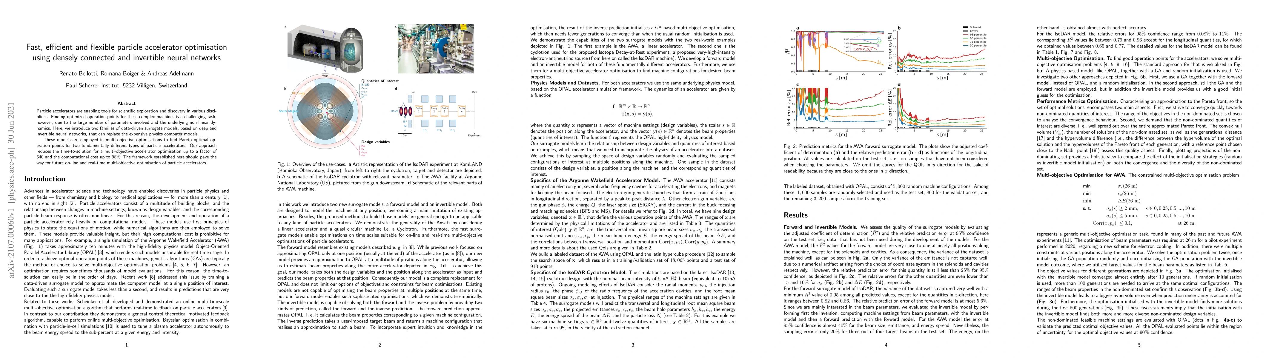 Particle accelerators are enabling tools for scientific exploration and discovery in various disciplines. Finding optimized operation points for these complex machines is a challenging task, however, due to the large number of parameters involved and the underlying non-linear dynamics. Here, we introduce two families of data-driven surrogate models, based on deep and invertible neural networks, that can replace the expensive physics computer models. These models are employed in multi-objective optimisations to find Pareto optimal operation points for two fundamentally different types of particle accelerators. Our approach reduces the time-to-solution for a multi-objective accelerator optimisation up to a factor of 640 and the computational cost up to 98%. The framework established here should pave the way for future on-line and real-time multi-objective optimisation of particle accelerators.