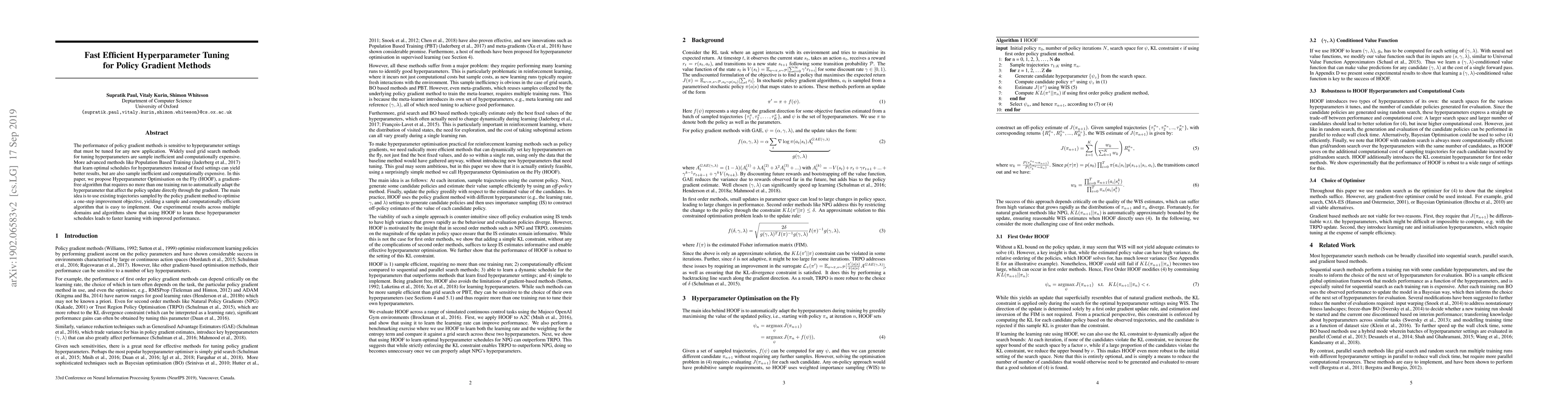 This paper introduces Hyperparameter Optimisation on the Fly (HOOF), a gradient-free algorithm for efficiently tuning hyperparameters in policy gradient methods. Unlike traditional methods, HOOF adapts hyperparameters during a single training run, significantly reducing sample and computational costs while improving learning speed and performance.