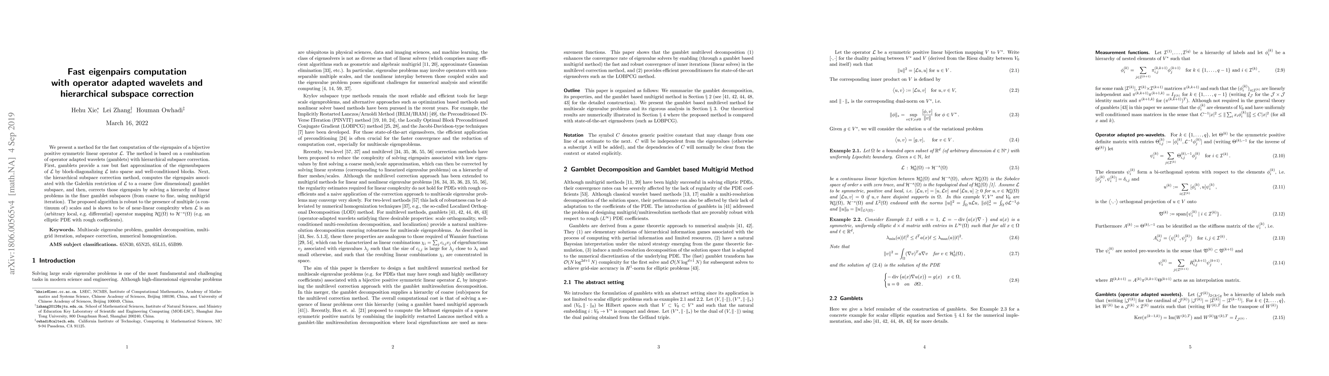 The paper introduces a method for fast computation of eigenpairs using operator-adapted wavelets and hierarchical subspace correction, showing near-linear complexity for solving elliptic PDEs with rough coefficients.