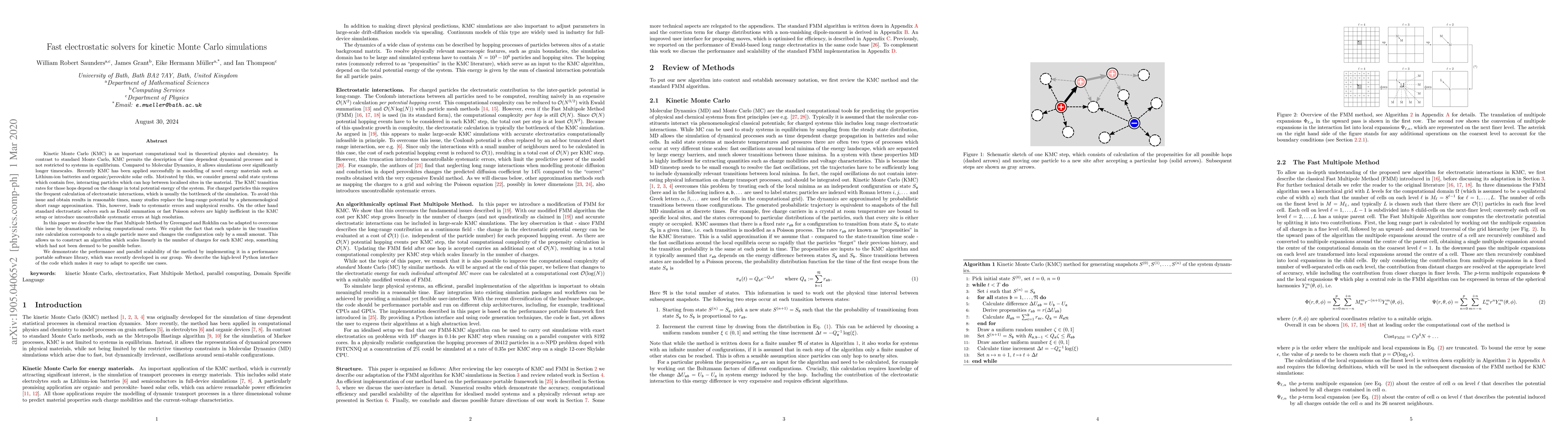 Kinetic Monte Carlo (KMC) is an important computational tool in physics and chemistry. In contrast to standard Monte Carlo, KMC permits the description of time dependent dynamical processes and is not restricted to systems in equilibrium. Recently KMC has been applied successfully in modelling of novel energy materials such as Lithium-ion batteries and solar cells. We consider general solid state systems which contain free, interacting particles which can hop between localised sites in the material. The KMC transition rates for those hops depend on the change in total potential energy of the system. For charged particles this requires the frequent calculation of electrostatic interactions, which is usually the bottleneck of the simulation. To avoid this issue and obtain results in reasonable times, many studies replace the long-range potential by a short range approximation. This, however, leads to systematic errors and unphysical results. On the other hand standard electrostatic solvers such as Ewald summation or fast Poisson solvers are highly inefficient or introduce uncontrollable systematic errors at high resolution. In this paper we describe how the Fast Multipole Method by Greengard and Rokhlin can be adapted to overcome this issue by dramatically reducing computational costs. We exploit the fact that each update in the transition rate calculation corresponds to a single particle move and changes the configuration only by a small amount. This allows us to construct an algorithm which scales linearly in the number of charges for each KMC step, something which had not been deemed to be possible before. We demonstrate the performance and parallel scalability of the method by implementing it in a performance portable software library. We describe the high-level Python interface of the code which makes it easy to adapt to specific cases.