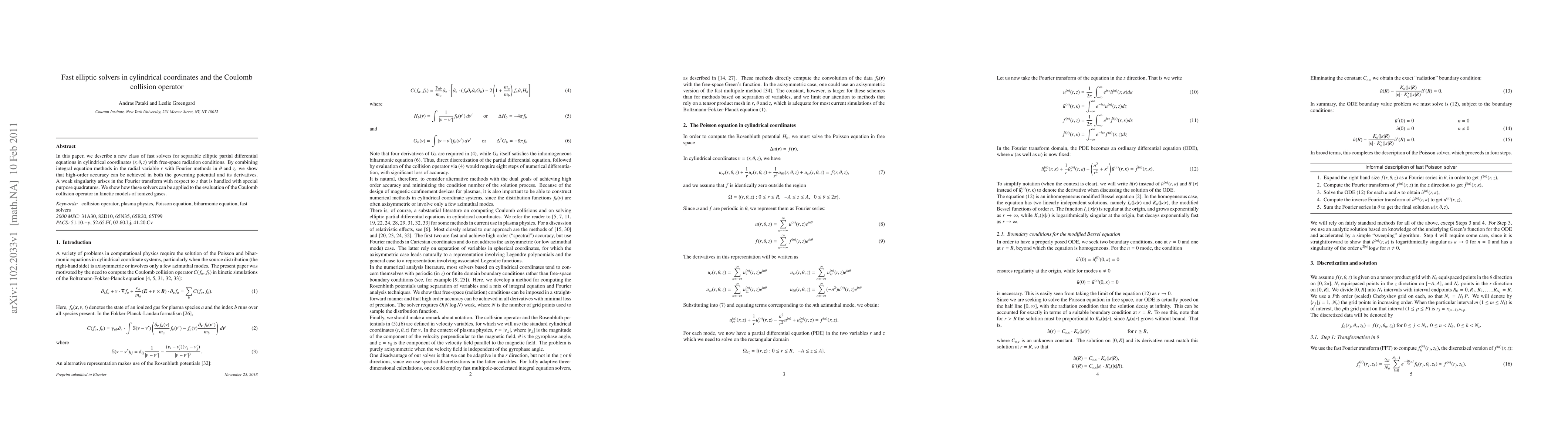 In this paper, we describe a new class of fast solvers for separable elliptic partial differential equations in cylindrical coordinates $(r,\theta,z)$ with free-space radiation conditions. By combining integral equation methods in the radial variable $r$ with Fourier methods in $\theta$ and $z$, we show that high-order accuracy can be achieved in both the governing potential and its derivatives. A weak singularity arises in the Fourier transform with respect to $z$ that is handled with special purpose quadratures. We show how these solvers can be applied to the evaluation of the Coulomb collision operator in kinetic models of ionized gases.