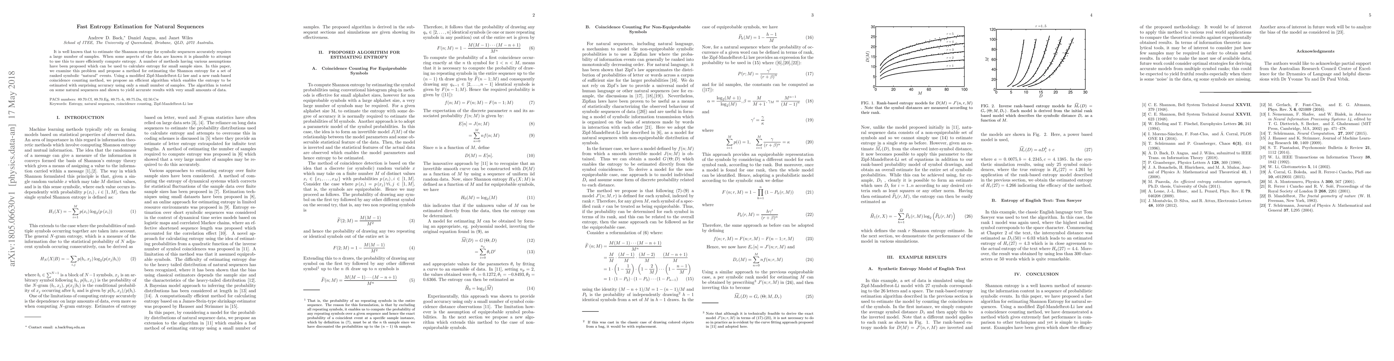 It is well known that to estimate the Shannon entropy for symbolic sequences accurately requires a large number of samples. When some aspects of the data are known it is plausible to attempt to use this to more efficiently compute entropy. A number of methods having various assumptions have been proposed which can be used to calculate entropy for small sample sizes. In this paper, we examine this problem and propose a method for estimating the Shannon entropy for a set of ranked symbolic natural events. Using a modified Zipf-Mandelbrot-Li law and a new rank-based coincidence counting method, we propose an efficient algorithm which enables the entropy to be estimated with surprising accuracy using only a small number of samples. The algorithm is tested on some natural sequences and shown to yield accurate results with very small amounts of data.