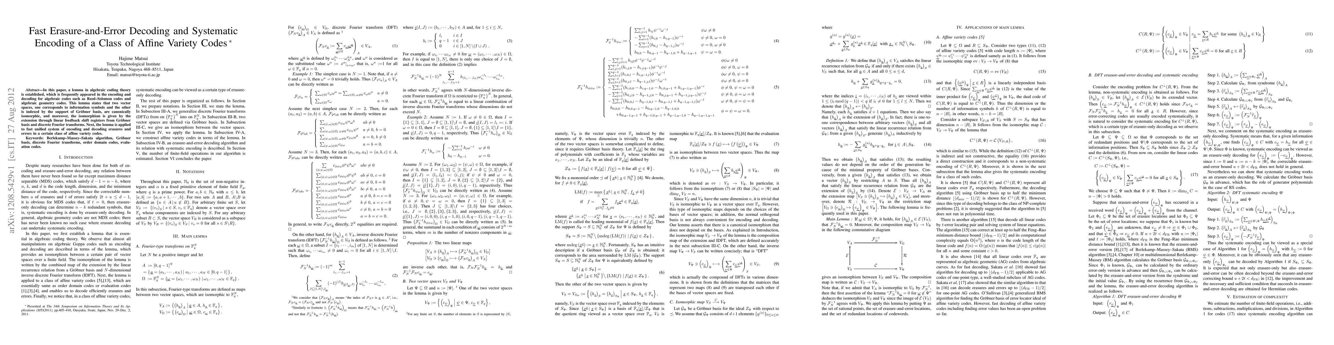 This paper establishes a lemma linking information symbols to the support of Grobner basis, proving their canonical isomorphism through linear feedback shift registers and discrete Fourier transforms. It applies this lemma to develop a fast unified encoding and decoding system for erasures and errors in a class of affine variety codes.