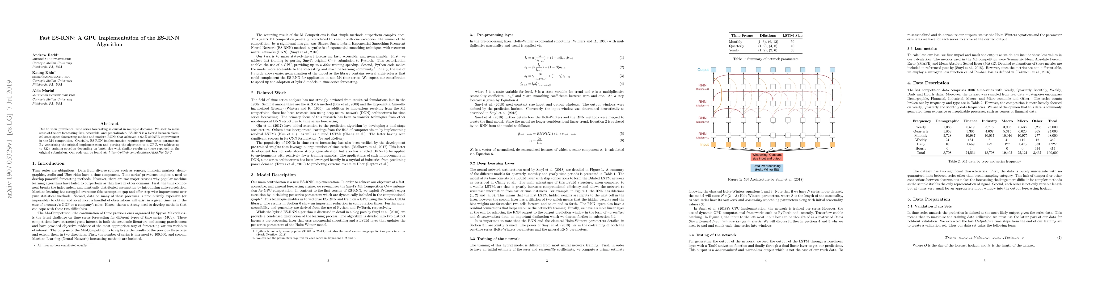 This paper presents a GPU-accelerated implementation of the ES-RNN algorithm, achieving up to 322x speedup in training compared to the original version, while maintaining comparable forecasting accuracy. The code is available for broader accessibility and use.