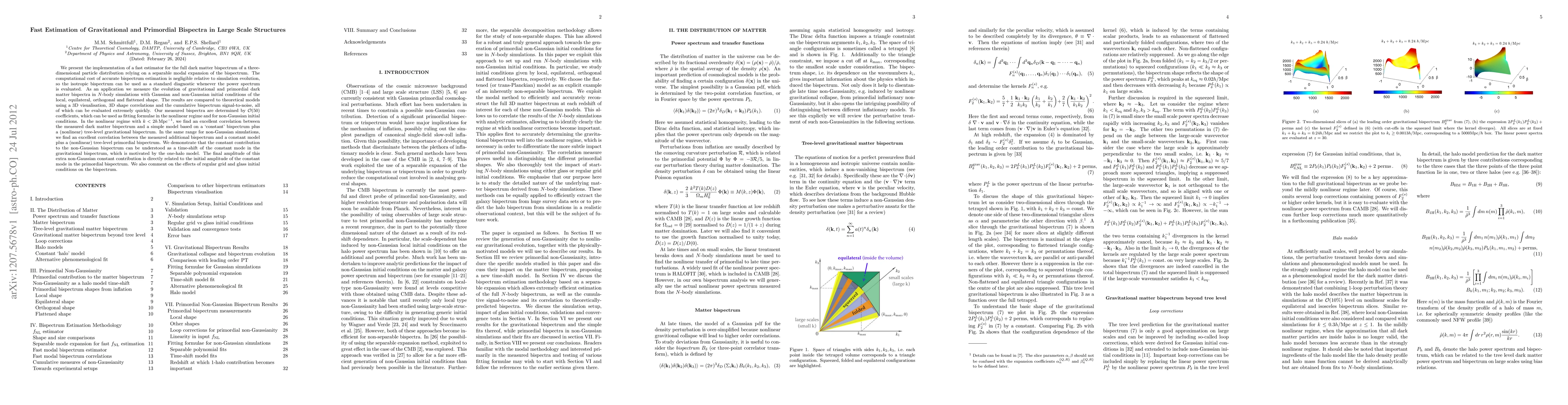 We present the implementation of a fast estimator for the full dark matter bispectrum of a three-dimensional particle distribution relying on a separable modal expansion of the bispectrum. The computational cost of accurate bispectrum estimation is negligible relative to simulation evolution, so the isotropic bispectrum can be used as a standard diagnostic whenever the power spectrum is evaluated. As an application we measure the evolution of gravitational and primordial dark matter bispectra in $N$-body simulations with Gaussian and non-Gaussian initial conditions of the local, equilateral, orthogonal and flattened shape. The results are compared to theoretical models using a 3D visualisation, 3D shape correlations and the cumulative bispectrum signal-to-noise, all of which can be evaluated extremely quickly. Our measured bispectra are determined by $\mathcal{O}(50)$ coefficients, which can be used as fitting formulae in the nonlinear regime and for non-Gaussian initial conditions. In the nonlinear regime with $k<2h\,\mathrm{Mpc}^{-1}$, we find an excellent correlation between the measured dark matter bispectrum and a simple model based on a `constant' bispectrum plus a (nonlinear) tree-level gravitational bispectrum. In the same range for non-Gaussian simulations, we find an excellent correlation between the measured additional bispectrum and a constant model plus a (nonlinear) tree-level primordial bispectrum. We demonstrate that the constant contribution to the non-Gaussian bispectrum can be understood as a time-shift of the constant mode in the gravitational bispectrum, which is motivated by the one-halo model. The final amplitude of this extra non-Gaussian constant contribution is directly related to the initial amplitude of the constant mode in the primordial bispectrum. We also comment on the effects of regular grid and glass initial conditions on the bispectrum.