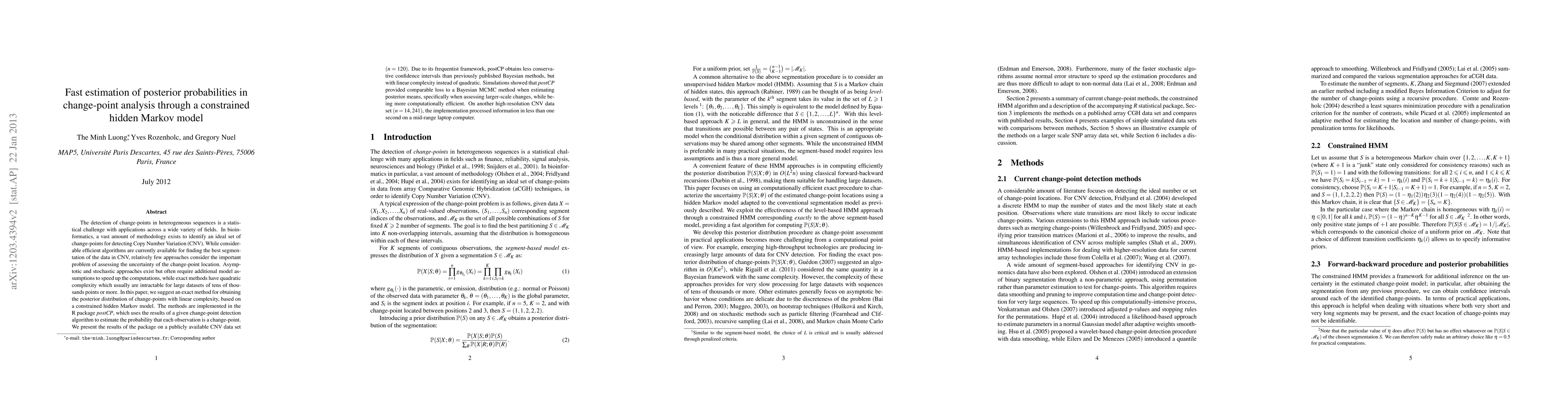 The detection of change-points in heterogeneous sequences is a statistical challenge with applications across a wide variety of fields. In bioinformatics, a vast amount of methodology exists to identify an ideal set of change-points for detecting Copy Number Variation (CNV). While considerable efficient algorithms are currently available for finding the best segmentation of the data in CNV, relatively few approaches consider the important problem of assessing the uncertainty of the change-point location. Asymptotic and stochastic approaches exist but often require additional model assumptions to speed up the computations, while exact methods have quadratic complexity which usually are intractable for large datasets of tens of thousands points or more. In this paper, we suggest an exact method for obtaining the posterior distribution of change-points with linear complexity, based on a constrained hidden Markov model. The methods are implemented in the R package postCP, which uses the results of a given change-point detection algorithm to estimate the probability that each observation is a change-point. We present the results of the package on a publicly available CNV data set (n=120). Due to its frequentist framework, postCP obtains less conservative confidence intervals than previously published Bayesian methods, but with linear complexity instead of quadratic. Simulations showed that postCP provided comparable loss to a Bayesian MCMC method when estimating posterior means, specifically when assessing larger-scale changes, while being more computationally efficient. On another high-resolution CNV data set (n=14,241), the implementation processed information in less than one second on a mid-range laptop computer.