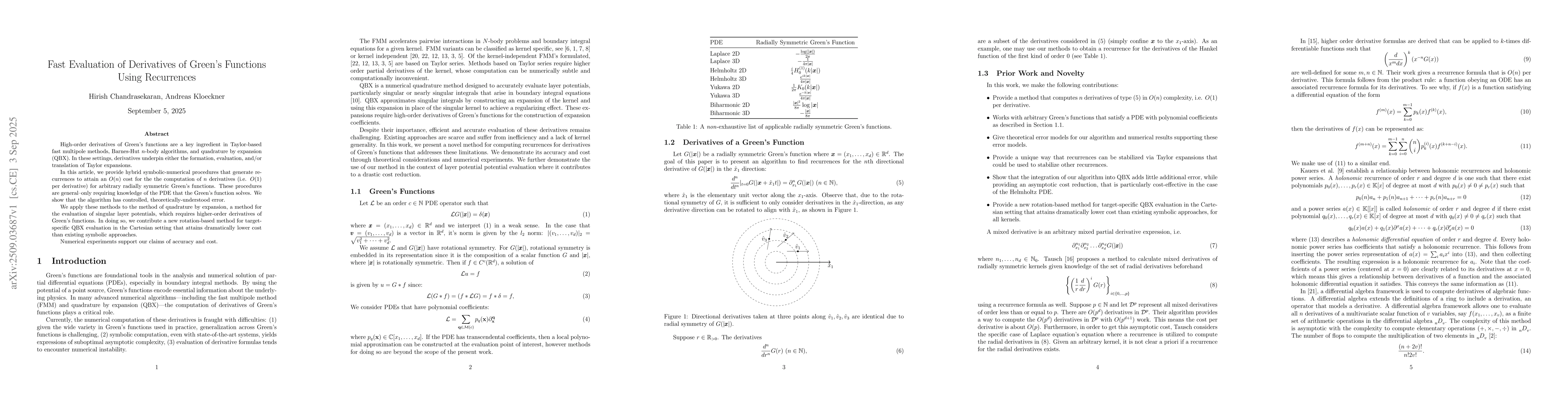 High-order derivatives of Green's functions are a key ingredient in Taylor-based fast multipole methods, Barnes-Hut $n$-body algorithms, and quadrature by expansion (QBX). In these settings, derivatives underpin either the formation, evaluation, and/or translation of Taylor expansions. In this article, we provide hybrid symbolic-numerical procedures that generate recurrences to attain an $O(n)$ cost for the the computation of $n$ derivatives (i.e. $O(1)$ per derivative) for arbitrary radially symmetric Green's functions. These procedures are general--only requiring knowledge of the PDE that the Green's function solves. We show that the algorithm has controlled, theoretically-understood error. We apply these methods to the method of quadrature by expansion, a method for the evaluation of singular layer potentials, which requires higher-order derivatives of Green's functions. In doing so, we contribute a new rotation-based method for target-specific QBX evaluation in the Cartesian setting that attains dramatically lower cost than existing symbolic approaches. Numerical experiments support our claims of accuracy and cost.