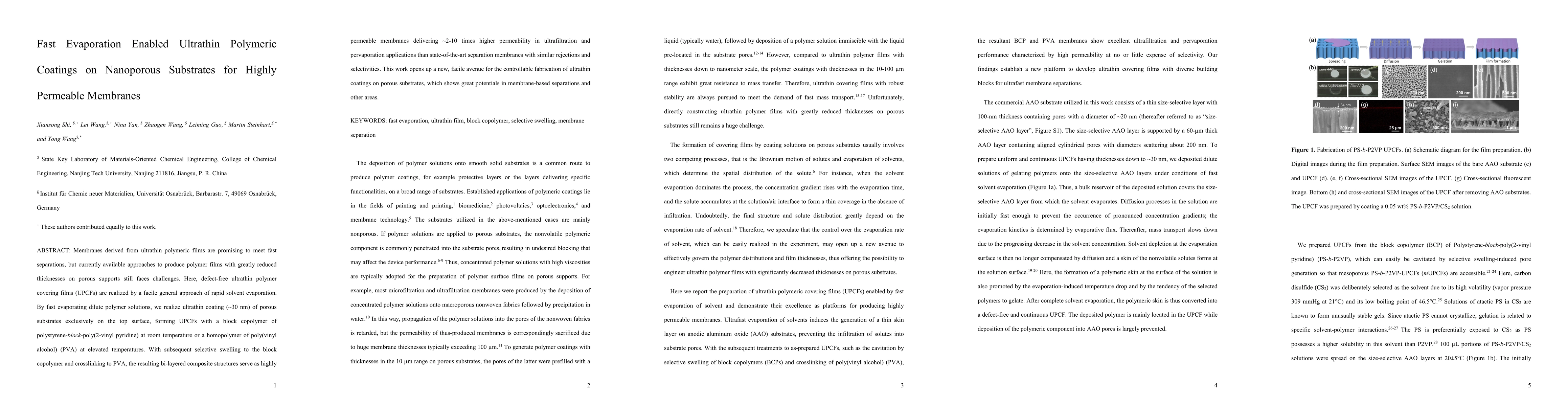This paper presents a novel method for creating defect-free ultrathin polymer coatings (~30 nm) on nanoporous substrates via rapid solvent evaporation, leading to highly permeable membranes with 2-10 times better performance in ultrafiltration and pervaporation compared to existing membranes. The approach uses block copolymers and homopolymers, showing great potential for advanced membrane-based separations.