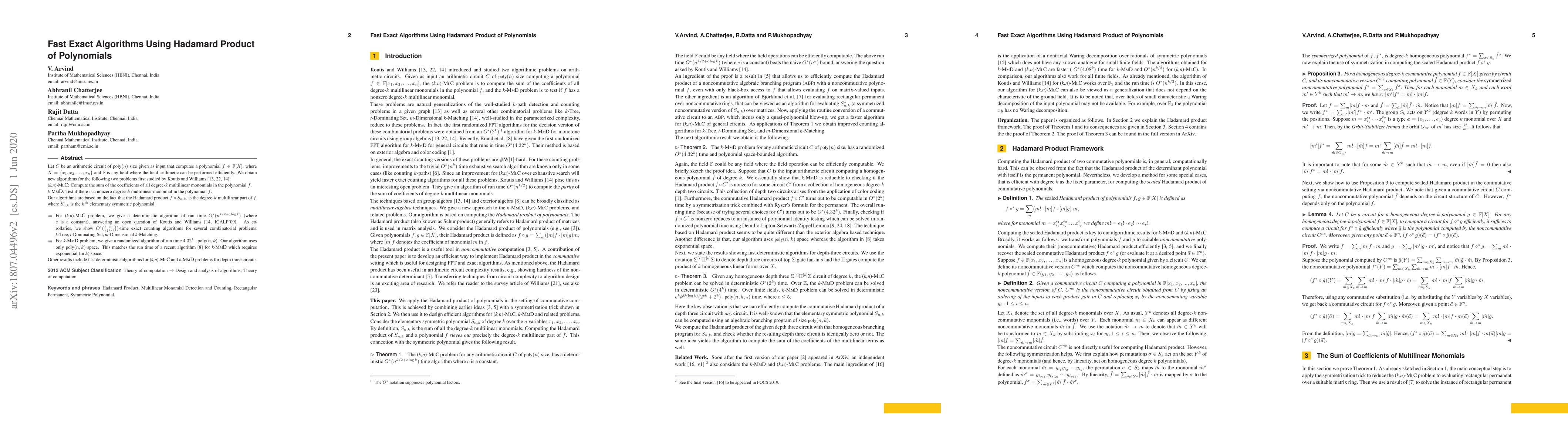 Let $C$ be an arithmetic circuit of $poly(n)$ size given as input that computes a polynomial $f\in\mathbb{F}[X]$, where $X=\{x_1,x_2,\ldots,x_n\}$ and $\mathbb{F}$ is any field where the field arithmetic can be performed efficiently. We obtain new algorithms for the following two problems first studied by Koutis and Williams \cite{Kou08, Wi09, KW16}. k-MLC: Compute the sum of the coefficients of all degree-$k$ multilinear monomials in the polynomial $f$. k-MMD: Test if there is a nonzero degree-$k$ multilinear monomial in the polynomial $f$. Our algorithms are based on the fact that the Hadamard product $f\circ S_{n,k}$, is the degree-$k$ multilinear part of $f$, where $S_{n,k}$ is the $k^{th}$ elementary symmetric polynomial. 1. For k-MLC problem, we give a deterministic algorithm of run time $O^*(n^{k/2+c\log k})$ (where $c$ is a constant), answering an open question of Koutis and Williams \cite[ICALP'09]{KW16}. As corollaries, we show $O^*(\binom{n}{\downarrow k/2})$-time exact counting algorithms for several combinatorial problems: k-Tree, t-Dominating Set, m-Dimensional k-Matching. 2. For k-MMD problem, we give a randomized algorithm of run time $4.32^k\cdot poly(n,k)$. Our algorithm uses only $poly(n,k)$ space. This matches the run time of a recent algorithm \cite{BDH18} for $k-MMD$ which requires exponential (in $k$) space. Other results include fast deterministic algorithms for k-MLC and k-MMD problems for depth three circuits.