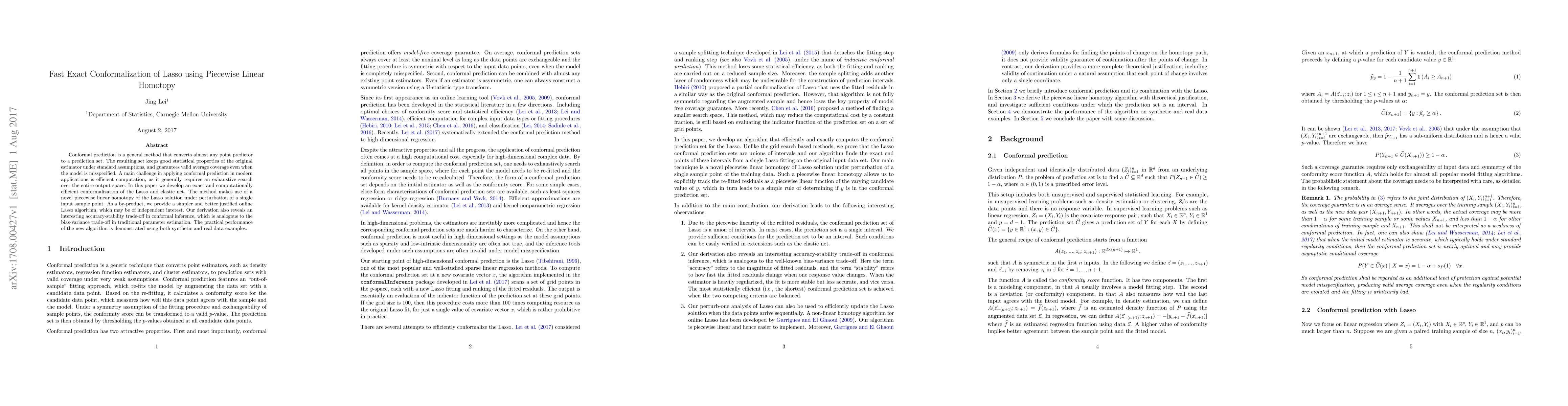 Conformal prediction is a general method that converts almost any point predictor to a prediction set. The resulting set keeps good statistical properties of the original estimator under standard assumptions, and guarantees valid average coverage even when the model is misspecified. A main challenge in applying conformal prediction in modern applications is efficient computation, as it generally requires an exhaustive search over the entire output space. In this paper we develop an exact and computationally efficient conformalization of the Lasso and elastic net. The method makes use of a novel piecewise linear homotopy of the Lasso solution under perturbation of a single input sample point. As a by-product, we provide a simpler and better justified online Lasso algorithm, which may be of independent interest. Our derivation also reveals an interesting accuracy-stability trade-off in conformal inference, which is analogous to the bias-variance trade-off in traditional parameter estimation. The practical performance of the new algorithm is demonstrated using both synthetic and real data examples.