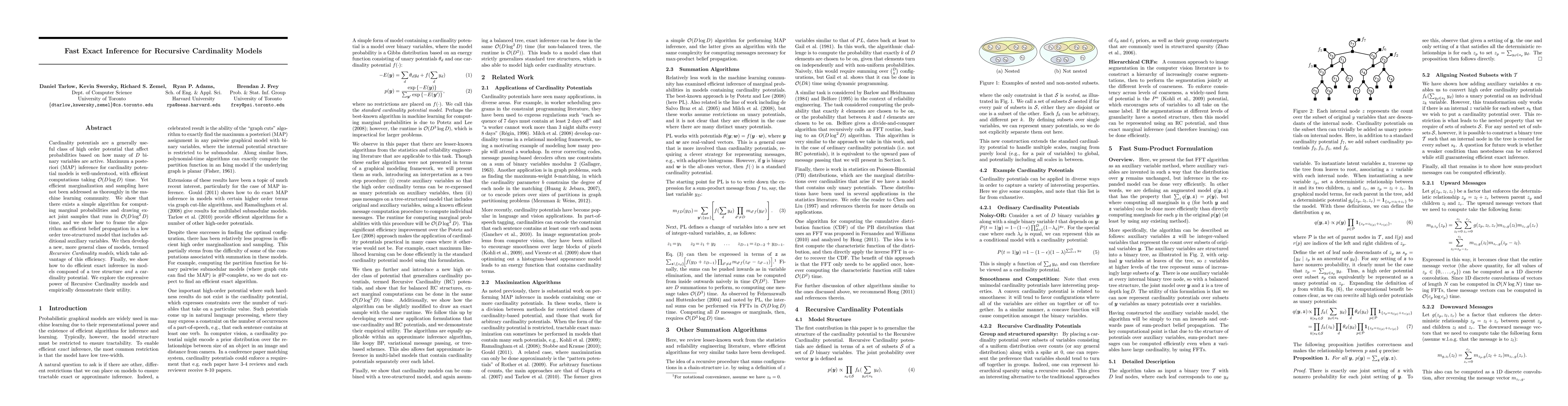 Cardinality potentials are a generally useful class of high order potential that affect probabilities based on how many of D binary variables are active. Maximum a posteriori (MAP) inference for cardinality potential models is well-understood, with efficient computations taking O(DlogD) time. Yet efficient marginalization and sampling have not been addressed as thoroughly in the machine learning community. We show that there exists a simple algorithm for computing marginal probabilities and drawing exact joint samples that runs in O(Dlog2 D) time, and we show how to frame the algorithm as efficient belief propagation in a low order tree-structured model that includes additional auxiliary variables. We then develop a new, more general class of models, termed Recursive Cardinality models, which take advantage of this efficiency. Finally, we show how to do efficient exact inference in models composed of a tree structure and a cardinality potential. We explore the expressive power of Recursive Cardinality models and empirically demonstrate their utility.