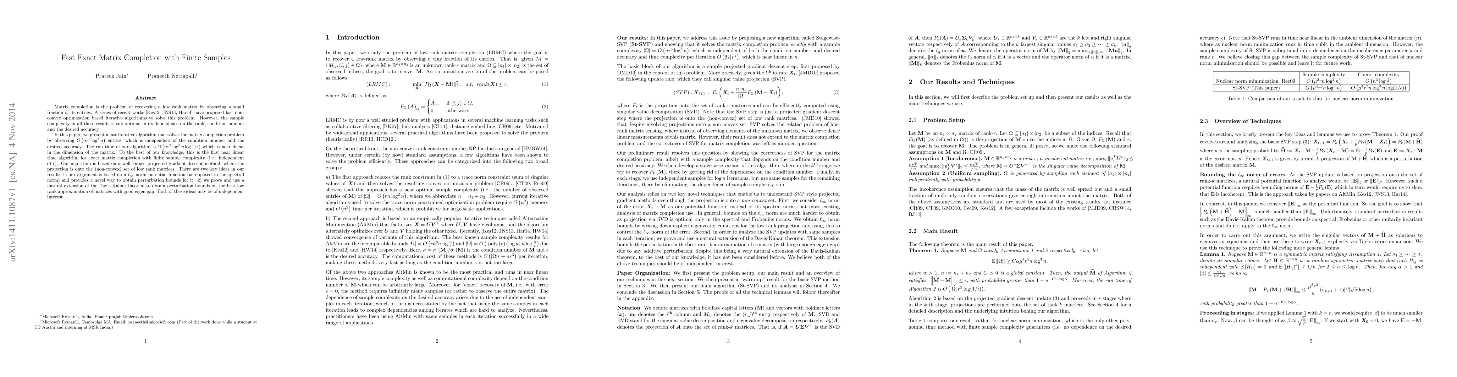 This paper introduces a fast iterative algorithm for exact matrix completion using a finite number of observed entries, achieving sample complexity independent of the condition number and desired accuracy. The algorithm leverages a projected gradient descent method with a novel $\ell_{\infty}$ norm potential function, and extends the Davis-Kahan theorem to provide perturbation bounds, achieving near-linear runtime.