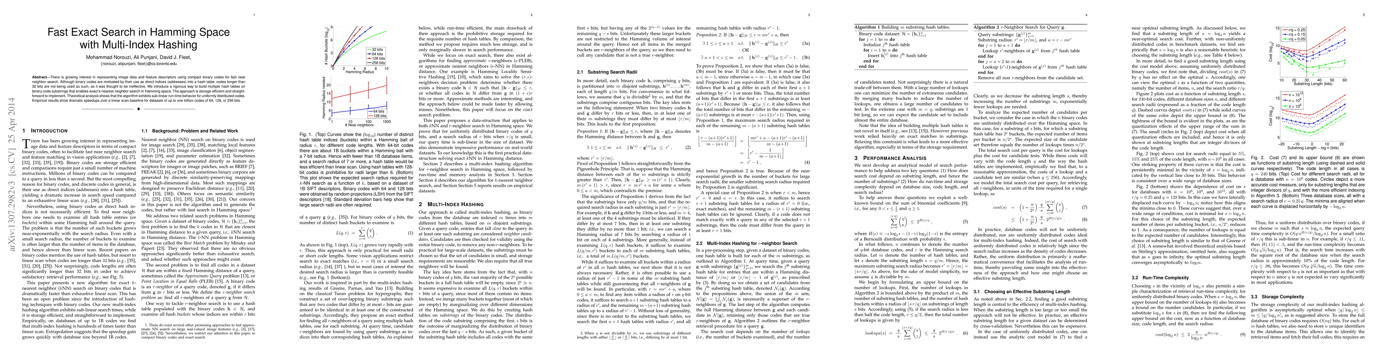 This paper proposes a method for fast exact search in Hamming space using multi-index hashing on binary code substrings, enabling efficient k-nearest neighbor search. It demonstrates sub-linear runtime and significant speedups over linear scan baselines for large datasets.