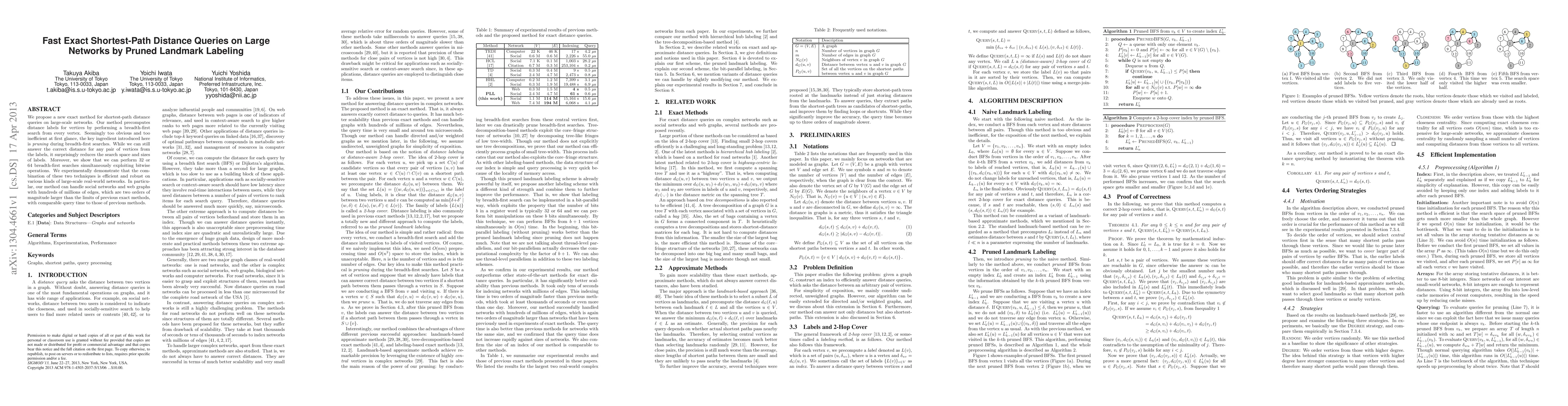 This paper introduces an efficient exact method for shortest-path distance queries on large networks using pruned landmark labeling, combining precomputed vertex labels from breadth-first searches with pruning techniques and parallel processing to handle networks with hundreds of millions of edges. The approach significantly reduces computational costs while maintaining accuracy.