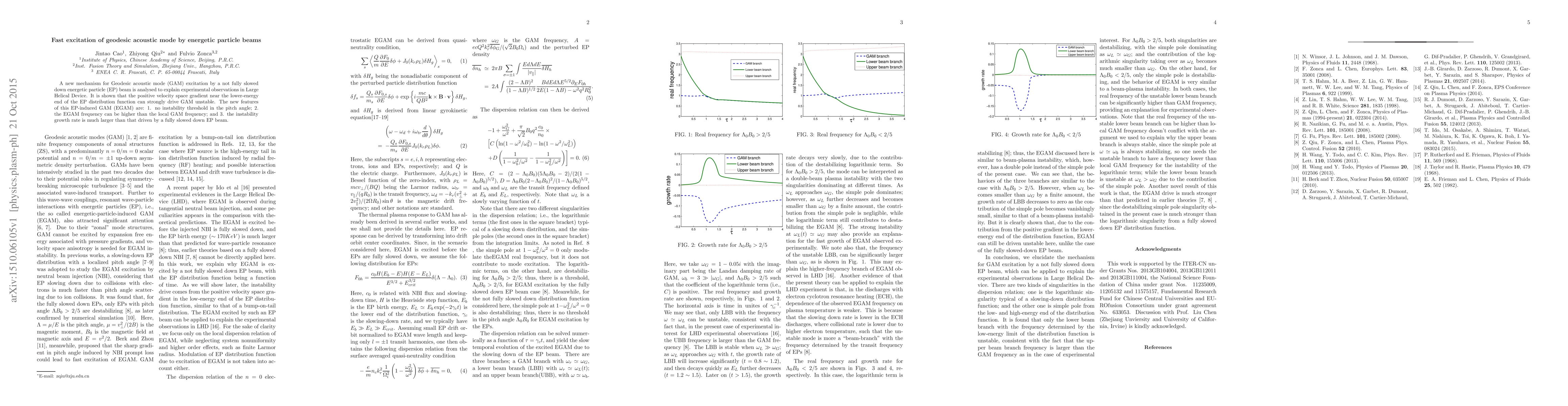 A new mechanism for Geodesic acoustic mode (GAM) excitation by a not fully slowed down energetic particle (EP) beam is analysed to explain experimental observations in Large Helical Device. It is shown that the positive velocity space gradient near the lower-energy end of the EP distribution function can strongly drive GAM unstable. The new features of this EP-induced GAM (EGAM) are: 1. no instability threshold in the pitch angle; 2. the EGAM frequency can be higher than the local GAM frequency; and 3. the instability growth rate is much larger than that driven by a fully slowed down EP beam.