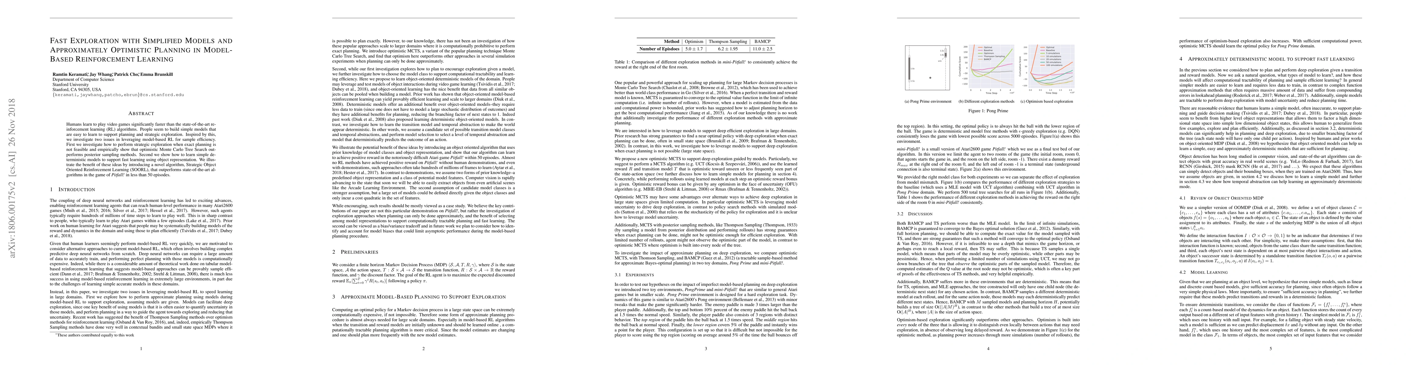 Humans learn to play video games significantly faster than the state-of-the-art reinforcement learning (RL) algorithms. People seem to build simple models that are easy to learn to support planning and strategic exploration. Inspired by this, we investigate two issues in leveraging model-based RL for sample efficiency. First we investigate how to perform strategic exploration when exact planning is not feasible and empirically show that optimistic Monte Carlo Tree Search outperforms posterior sampling methods. Second we show how to learn simple deterministic models to support fast learning using object representation. We illustrate the benefit of these ideas by introducing a novel algorithm, Strategic Object Oriented Reinforcement Learning (SOORL), that outperforms state-of-the-art algorithms in the game of Pitfall! in less than 50 episodes.
