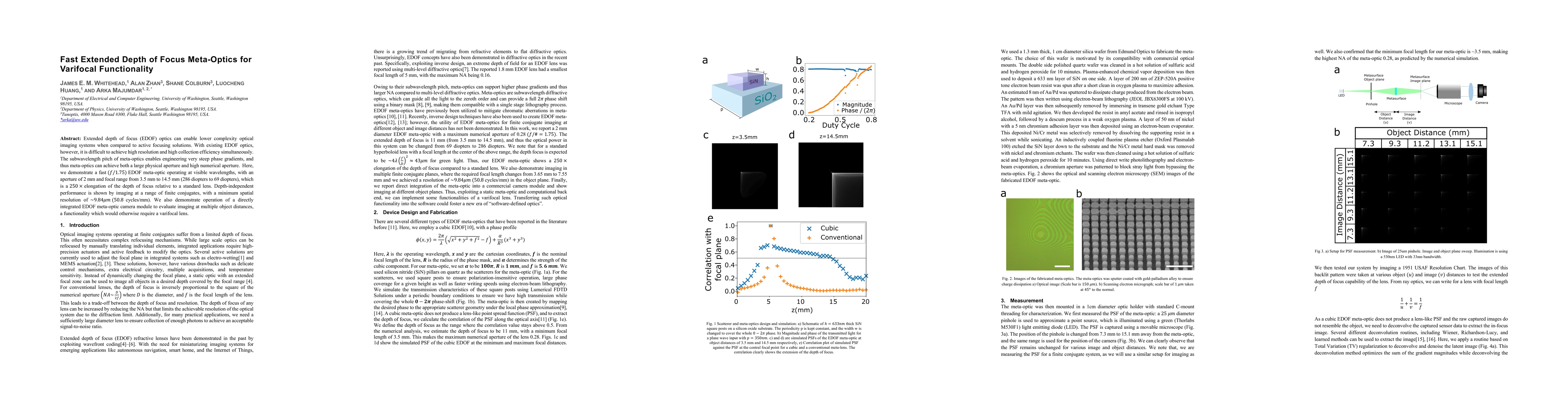 This paper presents a fast extended depth of focus (EDOF) meta-optic with an f/1.75 aperture, achieving a 250x elongation of depth of focus compared to standard lenses, while maintaining high resolution and collection efficiency. The meta-optic demonstrates depth-independent performance and is integrated into a camera module for varifocal functionality.