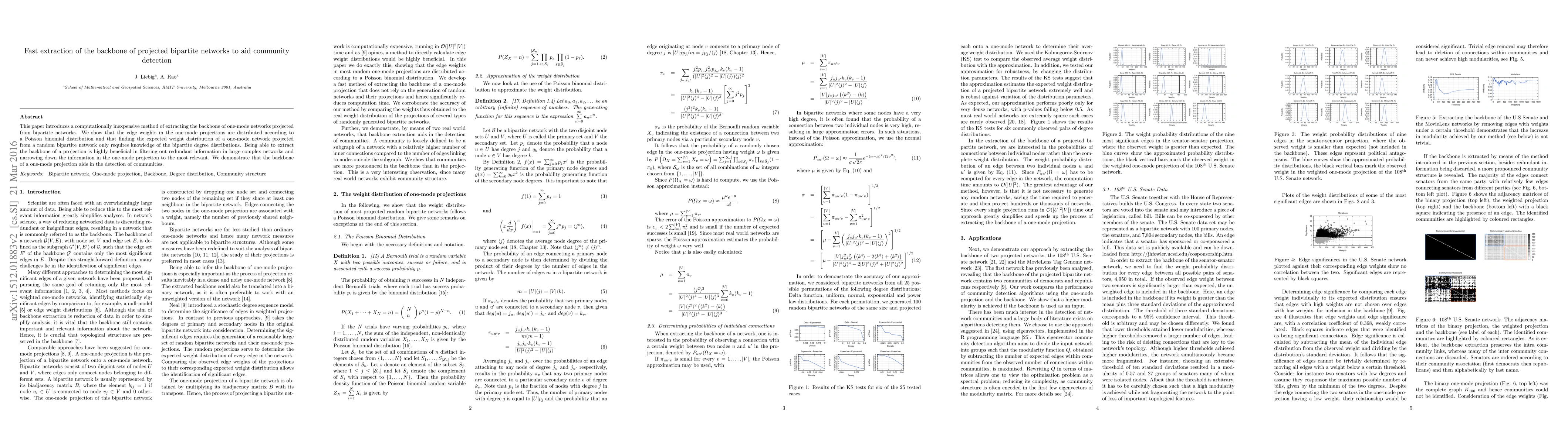 This paper presents a cost-effective method for extracting the backbone of one-mode projections from bipartite networks, revealing that edge weights follow a Poisson binomial distribution. This backbone extraction aids in community detection by filtering out redundant information.