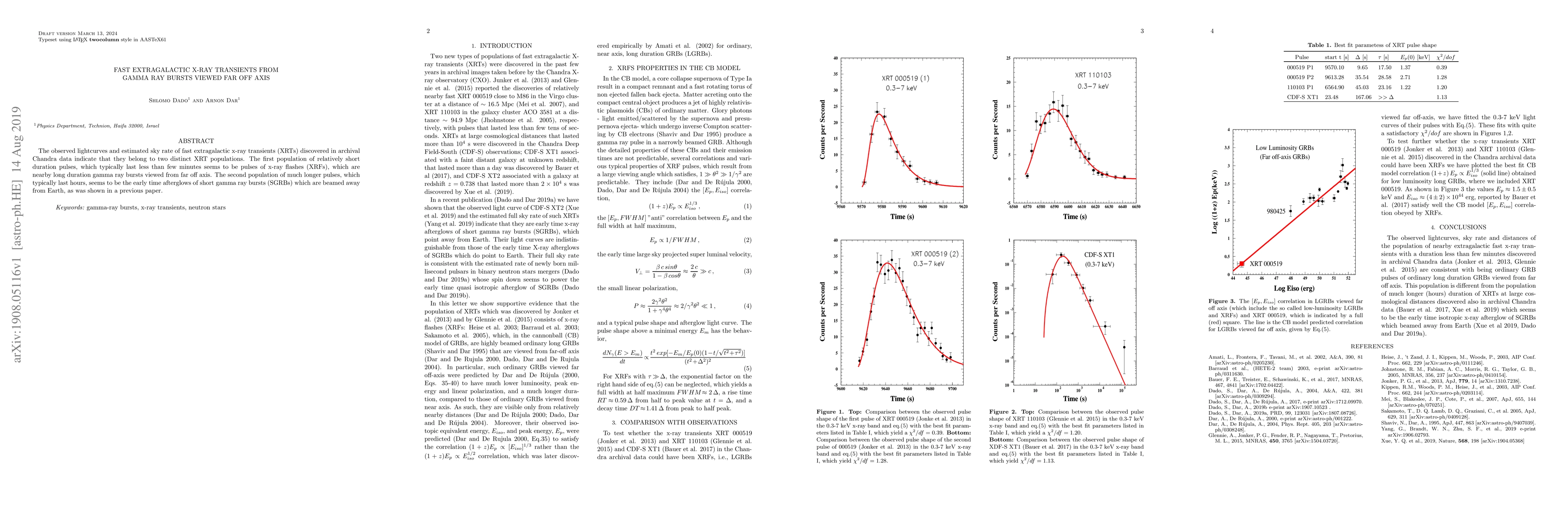 Summary: The study identifies two distinct populations of fast extragalactic X-ray transients (XRTs) in archival Chandra data: short-duration XRFs likely from long duration gamma ray bursts viewed off-axis, and longer-duration pulses from the early afterglows of short gamma ray bursts beamed away from Earth.
