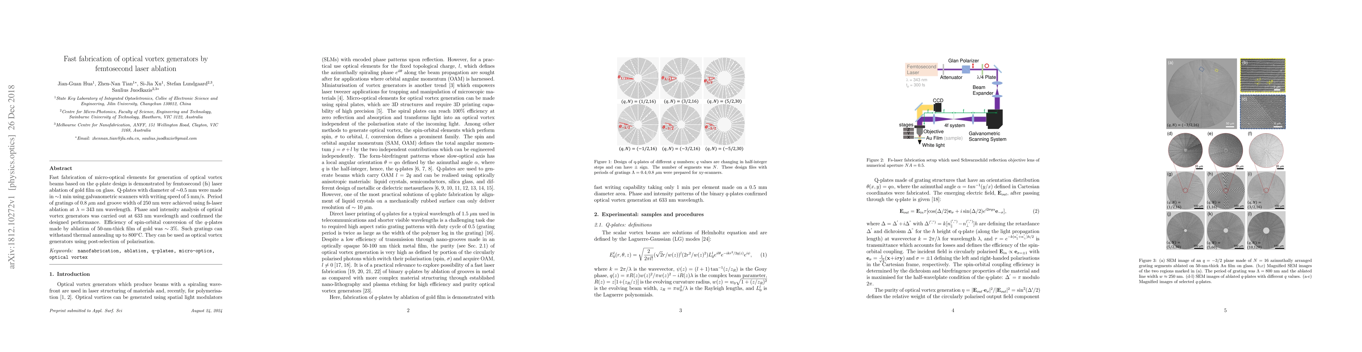 This paper demonstrates the rapid fabrication of micro-optical vortex generators using femtosecond laser ablation of gold films, achieving q-plates in under a minute with high precision. The fabricated elements show efficient spin-orbital conversion and can withstand high thermal annealing temperatures.
