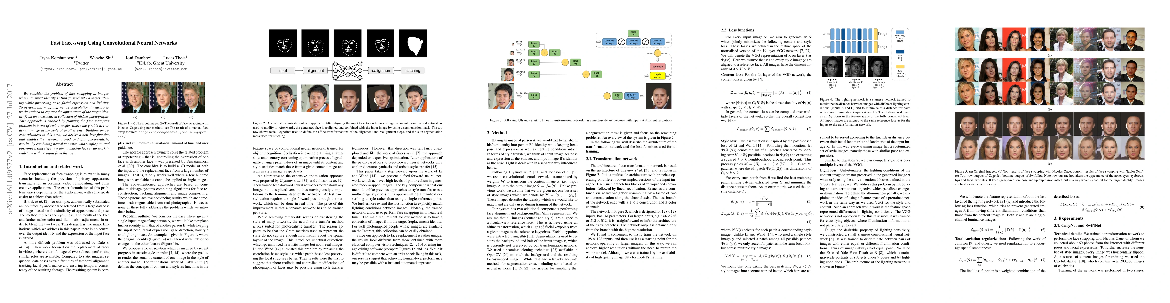 This paper proposes a fast face-swapping method using convolutional neural networks, leveraging a new loss function to achieve highly photorealistic results. The approach combines neural networks with minimal pre- and post-processing to enable real-time face swapping without user input.