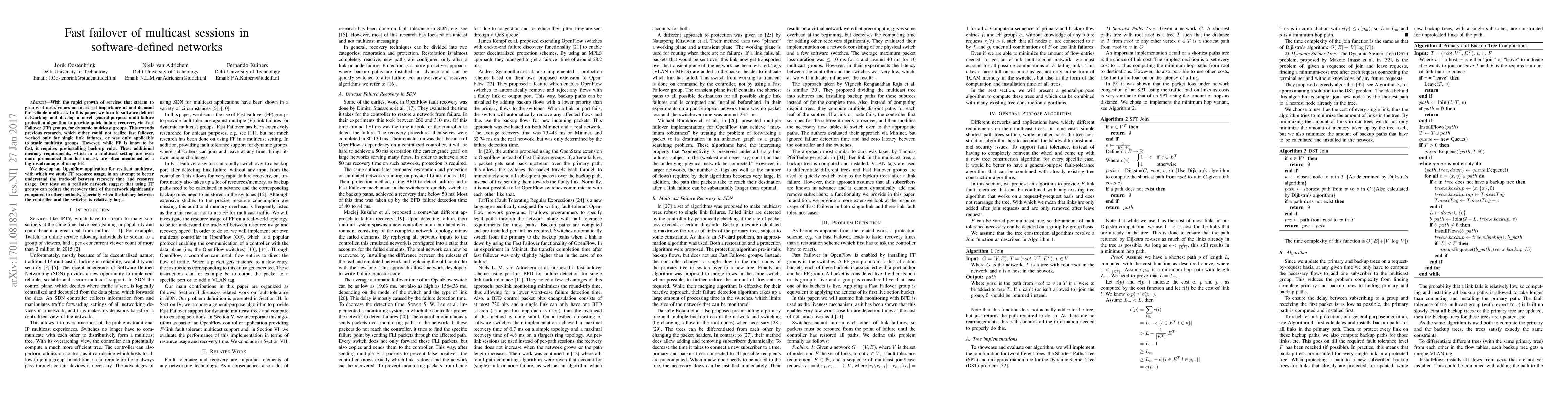This paper proposes a novel Fast Failover (FF) algorithm for software-defined networks to quickly recover multicast sessions from failures, addressing the limitations of previous methods. Despite the memory overhead of pre-installing back-up rules, the study finds that FF significantly reduces recovery time, especially in networks with high controller-switch latency.