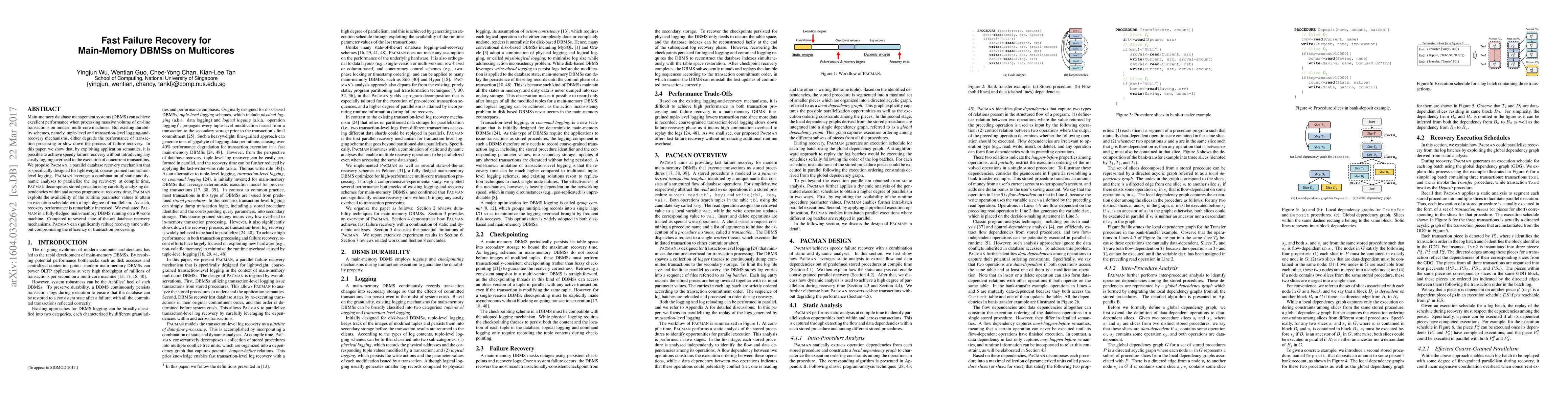 This paper proposes PACMAN, a parallel recovery mechanism for main-memory DBMSs on multicores, which achieves fast failure recovery by leveraging application semantics and parallelizing log recovery through static and dynamic analysis. PACMAN significantly reduces recovery time compared to existing methods without impacting transaction processing efficiency.