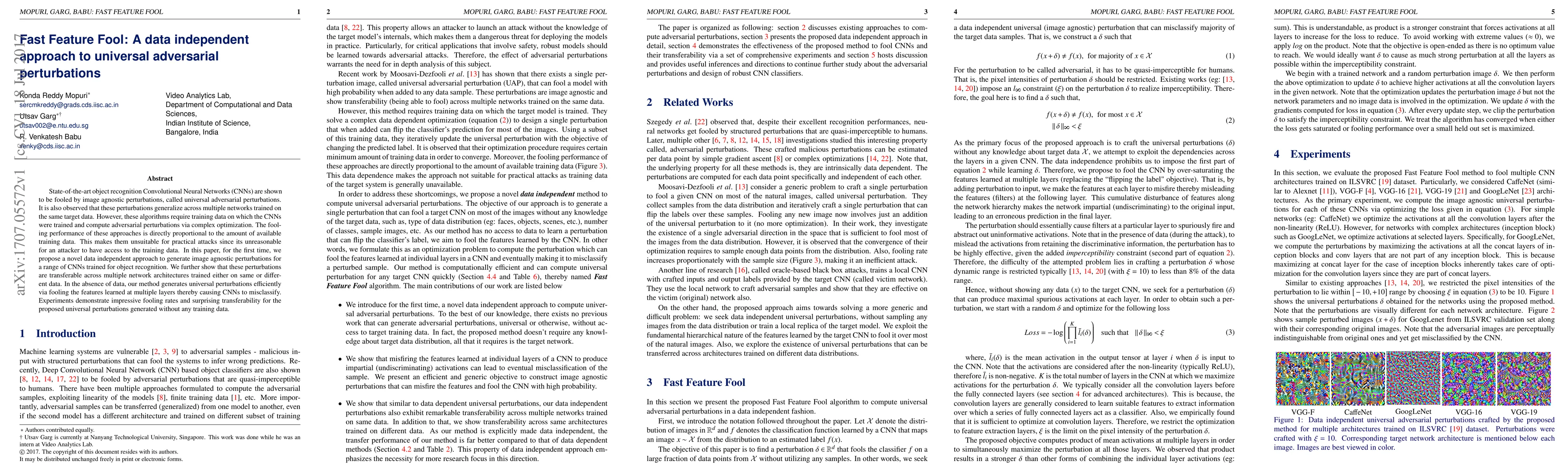 This paper introduces a novel data-independent method to generate universal adversarial perturbations for object recognition CNNs, which efficiently fools multiple network architectures without requiring access to training data. The proposed method demonstrates impressive transferability and high fooling rates across different CNNs.