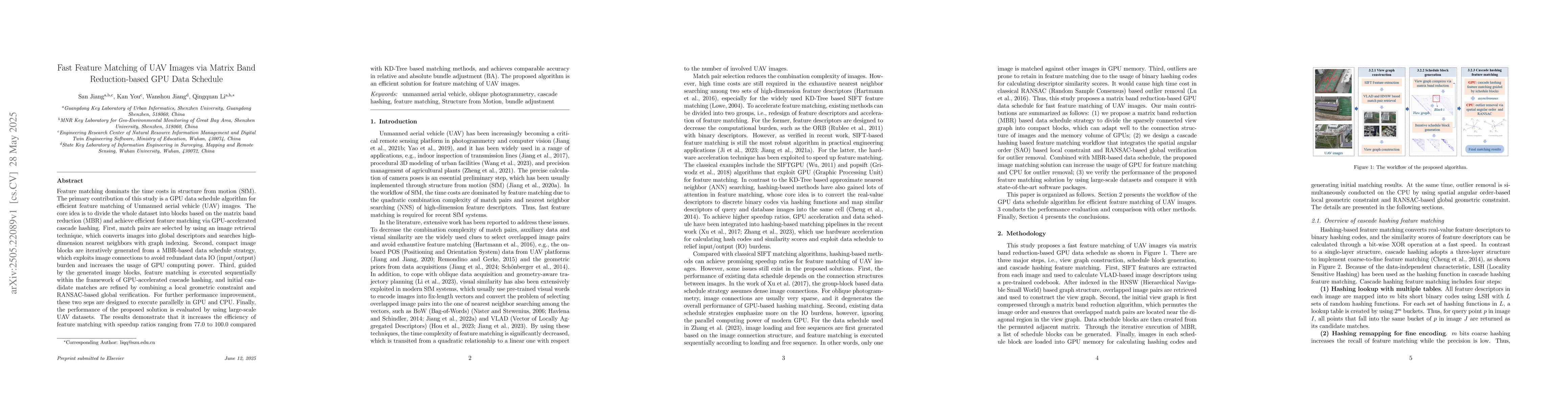 This work is novel in its application of Matrix Band Reduction for data scheduling in UAV image feature matching, combined with GPU-accelerated cascade hashing and parallel processing strategies, which significantly outperform traditional KD-Tree methods in terms of speed.