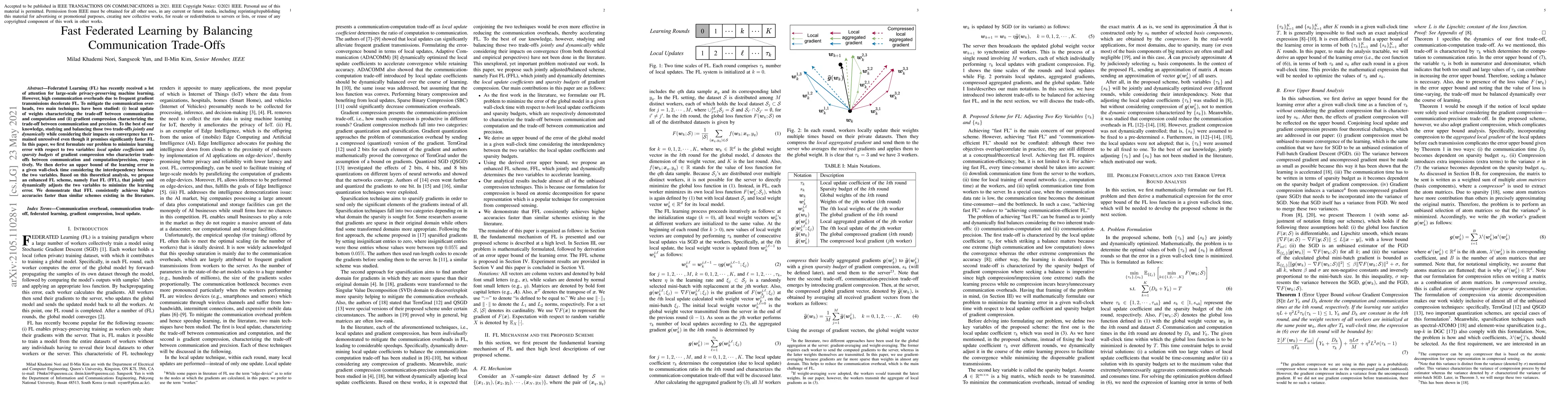This paper proposes Fast Federated Learning (FFL) to address high communication overheads in Federated Learning by dynamically balancing trade-offs between local update weights and gradient compression. The authors formulate a problem to minimize learning error, derive an upper bound, and demonstrate that FFL achieves higher accuracies faster than existing methods.
