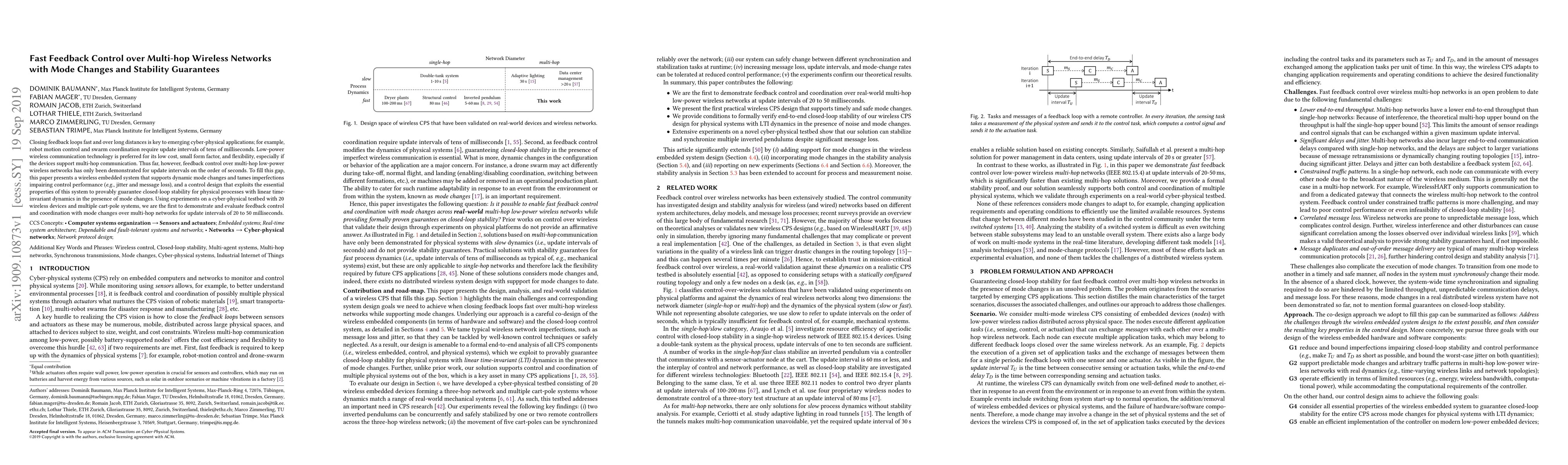 This paper introduces a wireless embedded system enabling fast feedback control over multi-hop networks, supporting dynamic mode changes to mitigate jitter and message loss. It presents a control design that guarantees stability for linear time-invariant systems amidst mode changes, demonstrated through experiments with 20 devices and cart-pole systems.