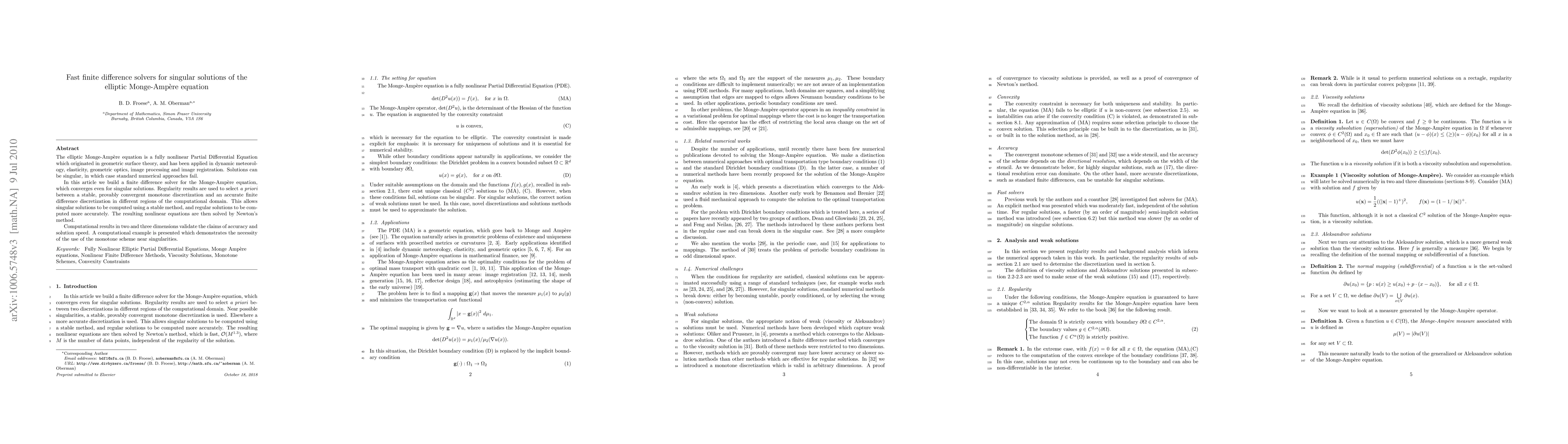 This paper develops a fast finite difference solver for the elliptic Monge-Ampere equation, capable of handling singular solutions through adaptive methods that switch between stable monotone and accurate discretizations. The approach is validated through computational results in multiple dimensions, demonstrating both accuracy and speed.