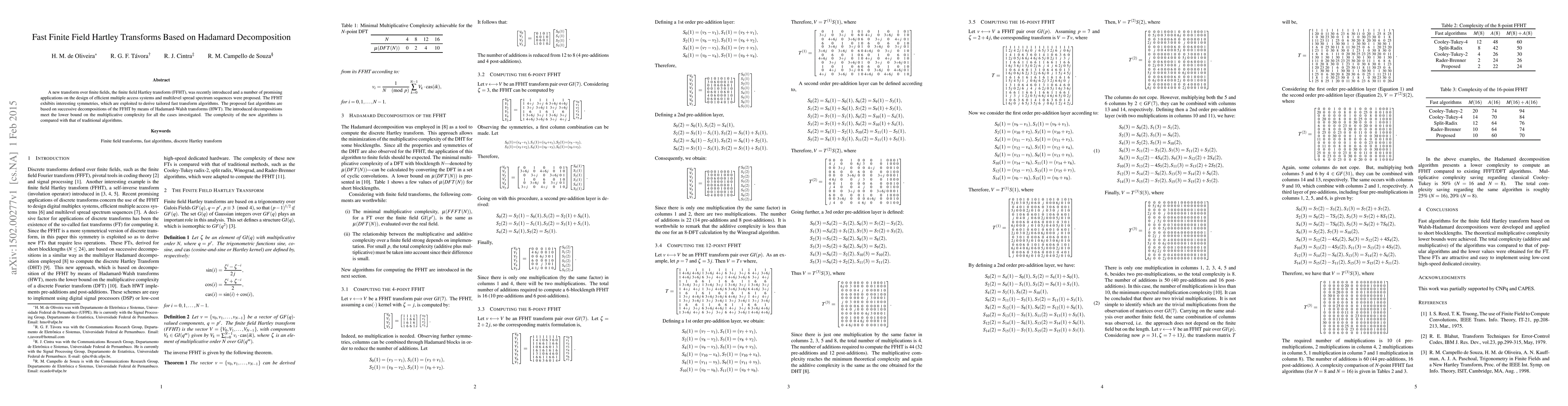The paper introduces fast algorithms for the finite field Hartley transform (FFHT) based on Hadamard-Walsh transform decompositions, which meet lower complexity bounds and outperform traditional methods. These optimized algorithms show potential for enhancing multiple access systems and spread spectrum sequences.