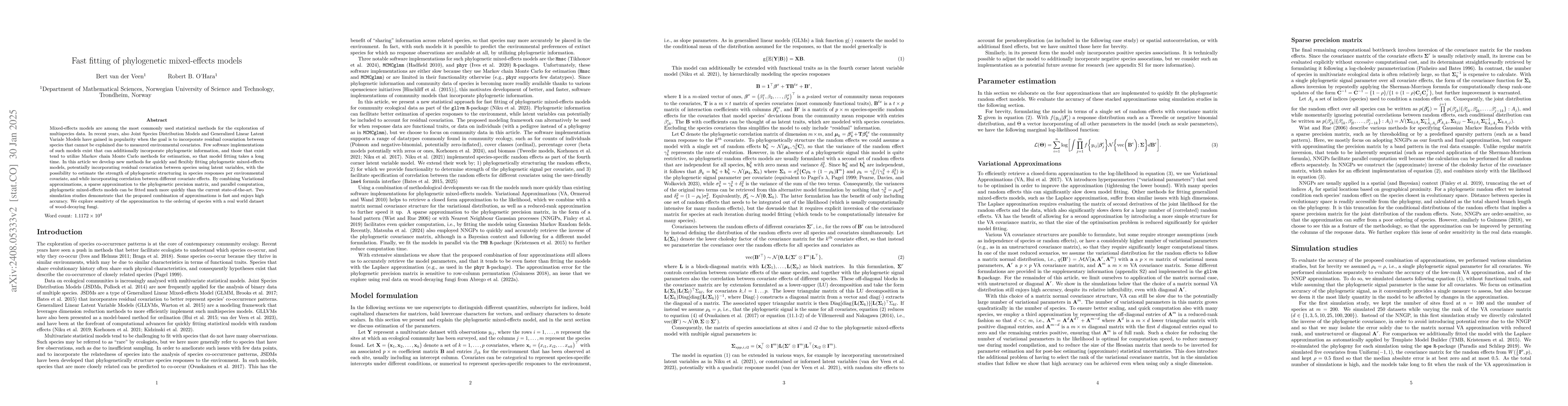 This paper introduces efficient methods for quickly fitting phylogenetic mixed effects models, combining Variational approximations and Nearest Neighbours Gaussian Processes, which significantly speed up the process compared to traditional MCMC methods, while maintaining high accuracy as demonstrated through simulations and a real dataset of wood-decaying fungi.