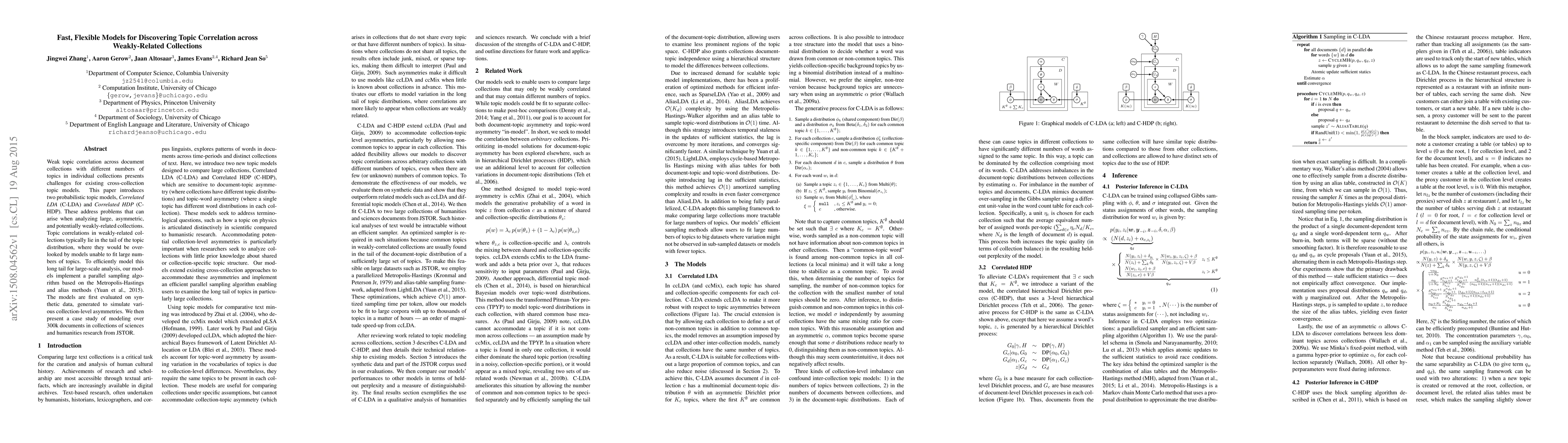 This paper introduces two probabilistic topic models, Correlated LDA (C-LDA) and Correlated HDP (C-HDP), to discover topic correlations across large, asymmetric, and potentially weakly-related document collections. The models employ a parallel sampling algorithm to efficiently handle the long tail of topic distributions, demonstrated through synthetic data evaluation and a case study on over 300k documents from JSTOR.