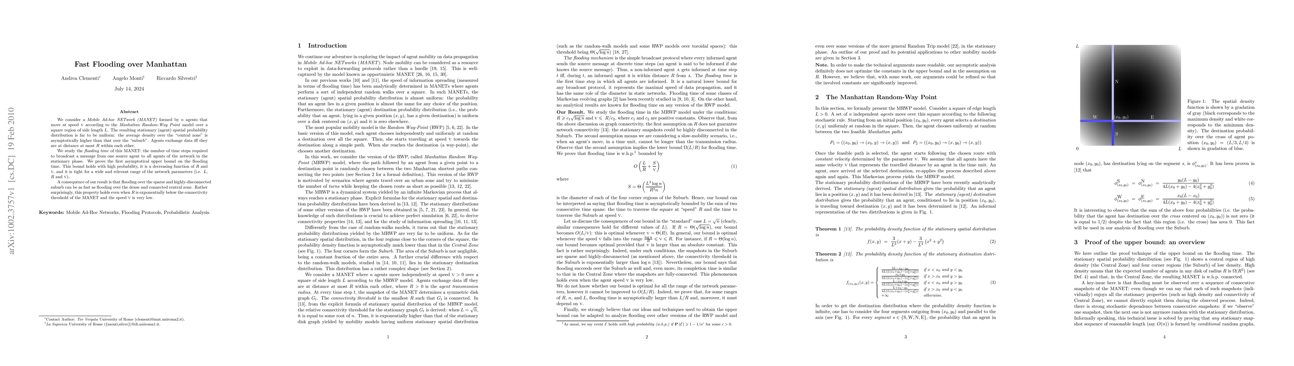 We consider a Mobile Ad-hoc NETwork (MANET) formed by n agents that move at speed V according to the Manhattan Random-Way Point model over a square region of side length L. The resulting stationary (agent) spatial probability distribution is far to be uniform: the average density over the "central zone" is asymptotically higher than that over the "suburb". Agents exchange data iff they are at distance at most R within each other. We study the flooding time of this MANET: the number of time steps required to broadcast a message from one source agent to all agents of the network in the stationary phase. We prove the first asymptotical upper bound on the flooding time. This bound holds with high probability, it is a decreasing function of R and V, and it is tight for a wide and relevant range of the network parameters (i.e. L, R and V). A consequence of our result is that flooding over the sparse and highly-disconnected suburb can be as fast as flooding over the dense and connected central zone. Rather surprisingly, this property holds even when R is exponentially below the connectivity threshold of the MANET and the speed V is very low.