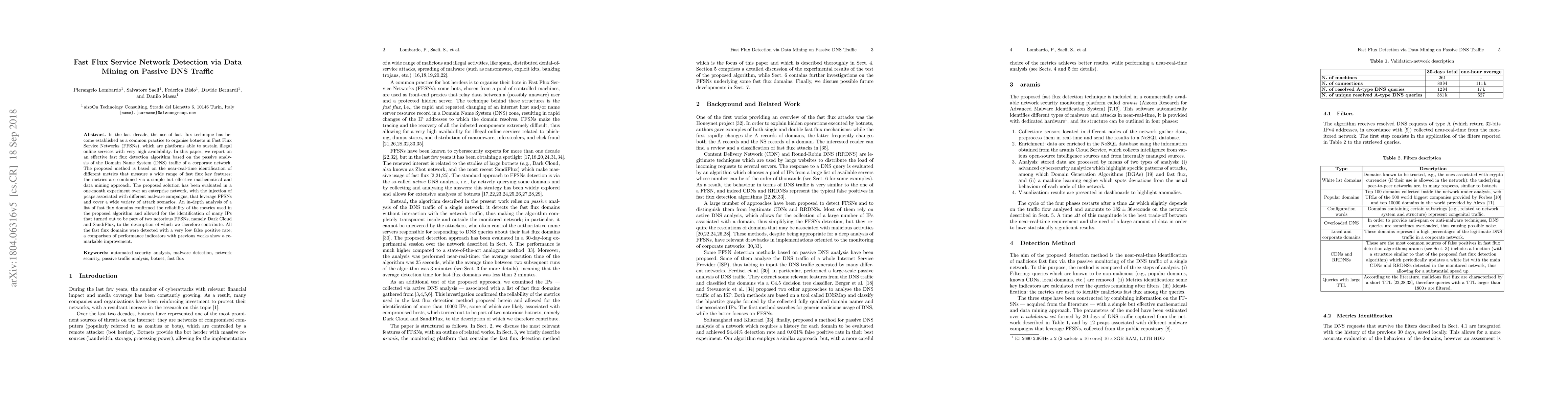 In the last decade, the use of fast flux technique has become established as a common practice to organise botnets in Fast Flux Service Networks (FFSNs), which are platforms able to sustain illegal online services with very high availability. In this paper, we report on an effective fast flux detection algorithm based on the passive analysis of the Domain Name System (DNS) traffic of a corporate network. The proposed method is based on the near-real-time identification of different metrics that measure a wide range of fast flux key features; the metrics are combined via a simple but effective mathematical and data mining approach. The proposed solution has been evaluated in a one-month experiment over an enterprise network, with the injection of pcaps associated with different malware campaigns, that leverage FFSNs and cover a wide variety of attack scenarios. An in-depth analysis of a list of fast flux domains confirmed the reliability of the metrics used in the proposed algorithm and allowed for the identification of many IPs that turned out to be part of two notorious FFSNs, namely Dark Cloud and SandiFlux, to the description of which we therefore contribute. All the fast flux domains were detected with a very low false positive rate; a comparison of performance indicators with previous works show a remarkable improvement.