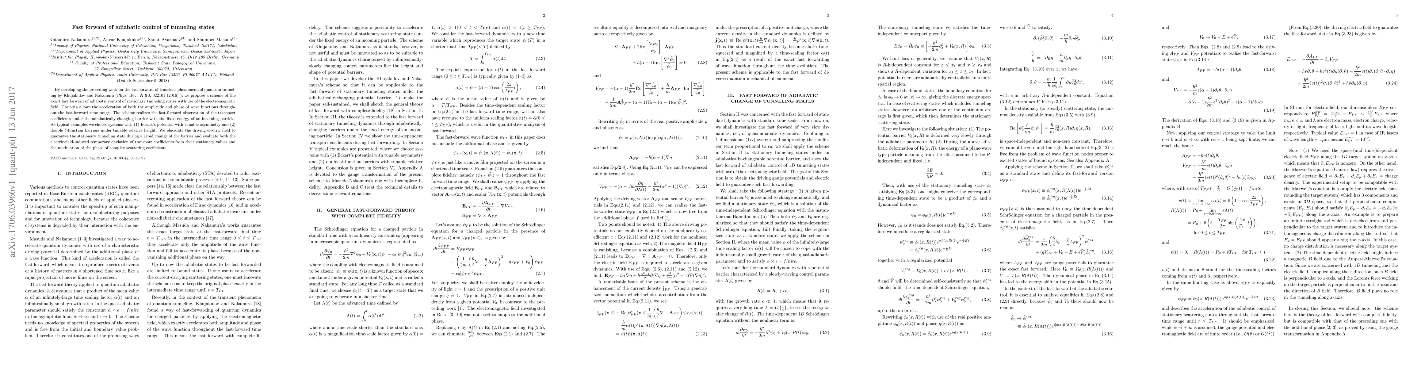 This paper proposes a method for the exact fast-forward adiabatic control of stationary tunneling states using electromagnetic fields, enabling acceleration of wave function amplitude and phase. The scheme allows for rapid observation of transport coefficients under changing barriers while maintaining fixed particle energy.